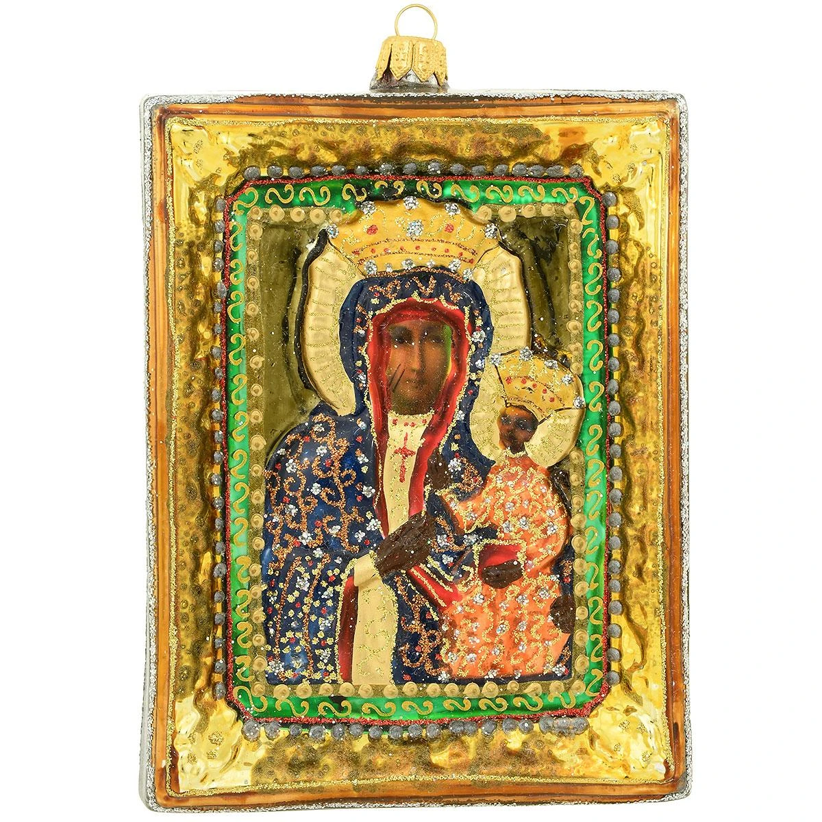 Depicting a portrait of Mary and Jesus, the famous painting known as “Our Lady of Czestochowa” is said to have been painted by St. Luke. Brought to Poland in 1382 and kept at the shrine Jasna Gora, the famous painting has become a symbol hope in times of hardship and is attributed to many miracles. Magnificently crafted of glass in Poland, this beautiful Our Lady of Czestochowa ornament depicts the famous painting in a myriad of vibrant glazes, sparkling glitter, and metallic gold accents. Keepsake measures approximately 5¼” tall x 4″ wide and comes beautifully boxed for convenient storage and gift giving.