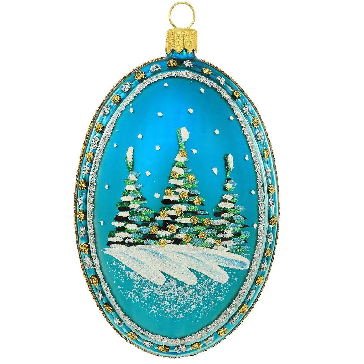 Shimmering in a vivid hue of aqua blue, this stunning oval shaped medallion depicts a lone cabin by a stream and forest covered in snow. Shimmering with colorful glitter accents, 4″ glass ornament is expertly handmade in Poland and features a trio of snowy pine trees on reverse side.Â