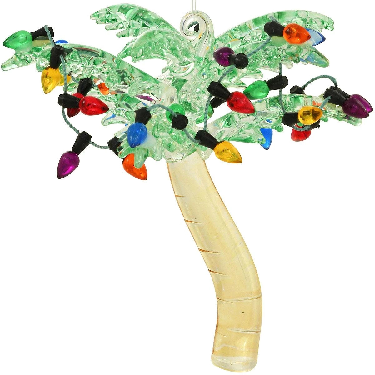 Oh Christmas tree….your branches are so palm-y! Why not enjoy a tropical holiday this year with this beautiful spun glass palm tree strung with colorful holiday lights. Shimmering in transparent hues of amber and green, this unique Christmas palm tree ornament comes ready to hang with a clear monofilament line with a hanging height of approximately 3½”.