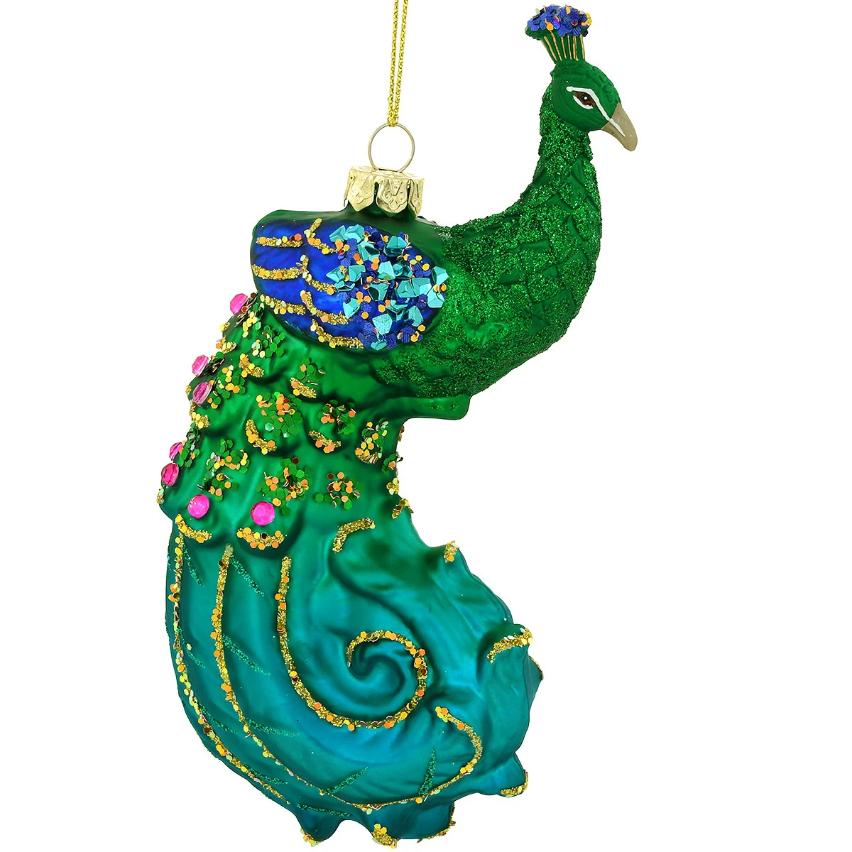 This bird is, quite naturally, pretty as a peacock! Artfully rendered in glass, our proud peacock shows off his true colors with a vivid plumage of green, blue, and turquoise. Embellished with dazzling gold glitter and an array of pink acrylic gems, this eye-catching, 6″ ornament comes ready to hang on a gold cord.Â