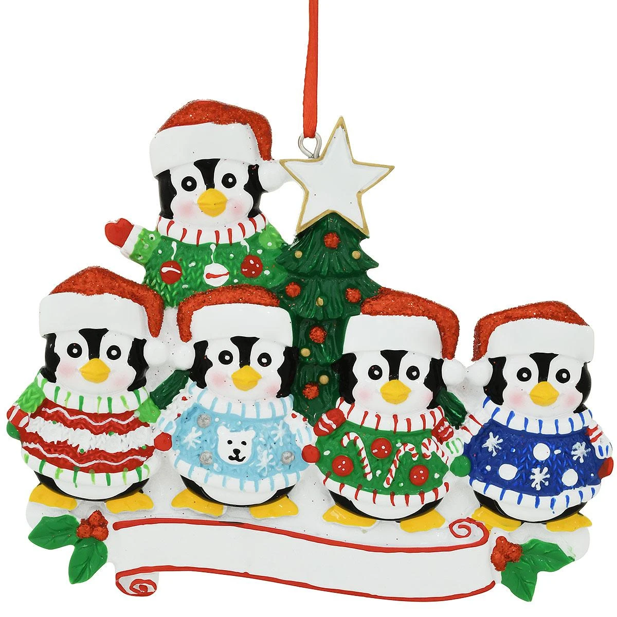Please select the alternate image for a view of this 5 penguins in Christmas sweaters ornament without personalization.