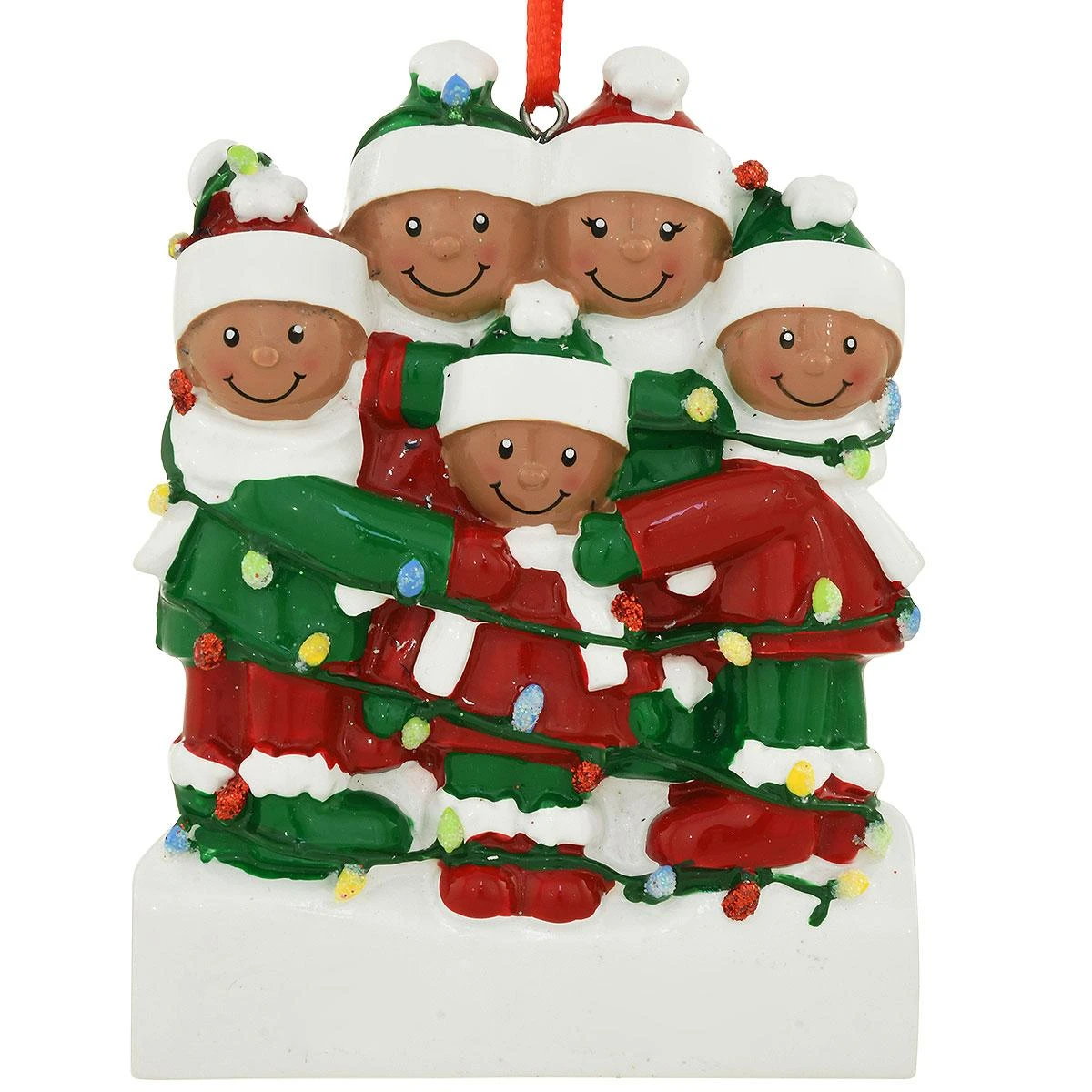 Searching for a special gift for the close-knit family on your list? All Tangled in Christmas lights, this happy African American Family of 5 sport festive sweaters, hats, and scarves. Beautifully crafted of resin, this charming 3¾” tall ornament is adorned with bright hand painted accents of red, white, and green and shimmers with eye-catching glitter. Coming ready to display with a red ribbon, this wonderful keepsake can be personalized by one of our talented Bronner’s artists in black paint pen at no additional charge!