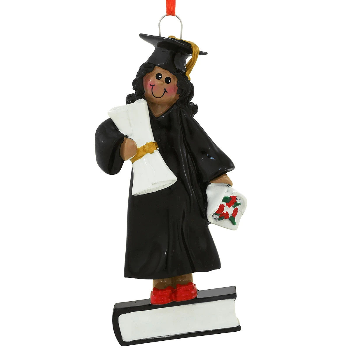 The tassel was worth the hassle! Standing on the podium with diploma and flower bouquet in hand, this special graduate is ready to step into a promising future. Artfully crafted of resin, our 4¼” tall personalized African American graduate girl ornament is vividly painted in charming detail and comes ready to hang on a red ribbon.Â