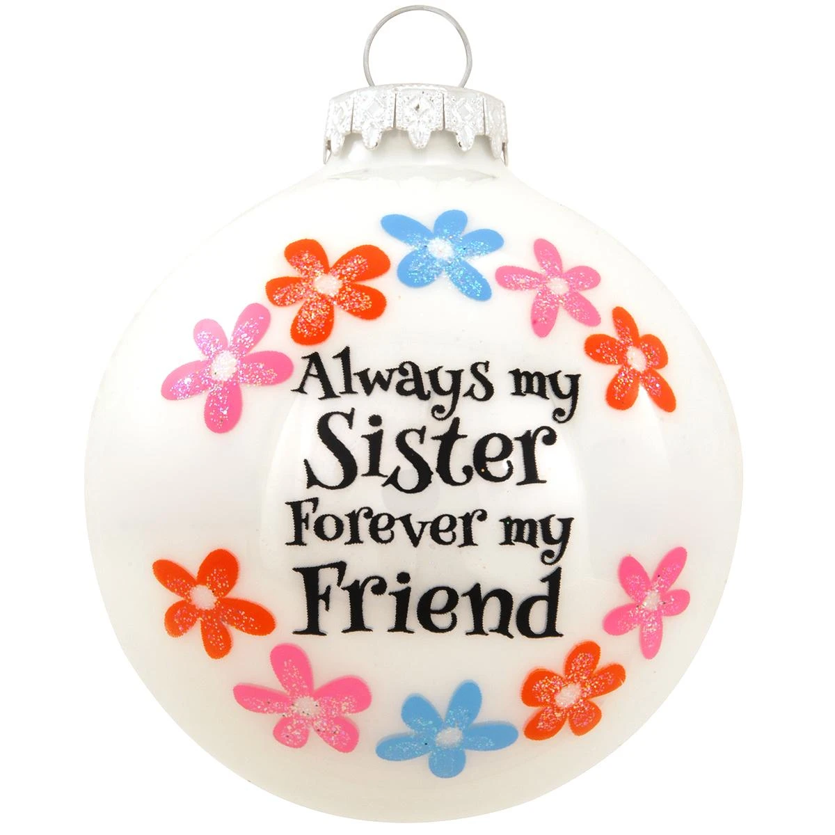 You may have inherited your sister through genealogy, but it’s the relational investment that makes her such a gift! Crafted of glass exclusively for Bronner’s from Hungary, our 3″ tall white enameled ornament features the sentiment “Always my Sister, Forever my Friend” surrounded by pink, coral, and blue flowers accented in iridescent glitter. Whether personalized with a black paint pen by our professional Bronner’s artists at no additional charge or plain, this charming Always My Sister ornament is sure to be a treasured keepsake with your loved one for years to come!