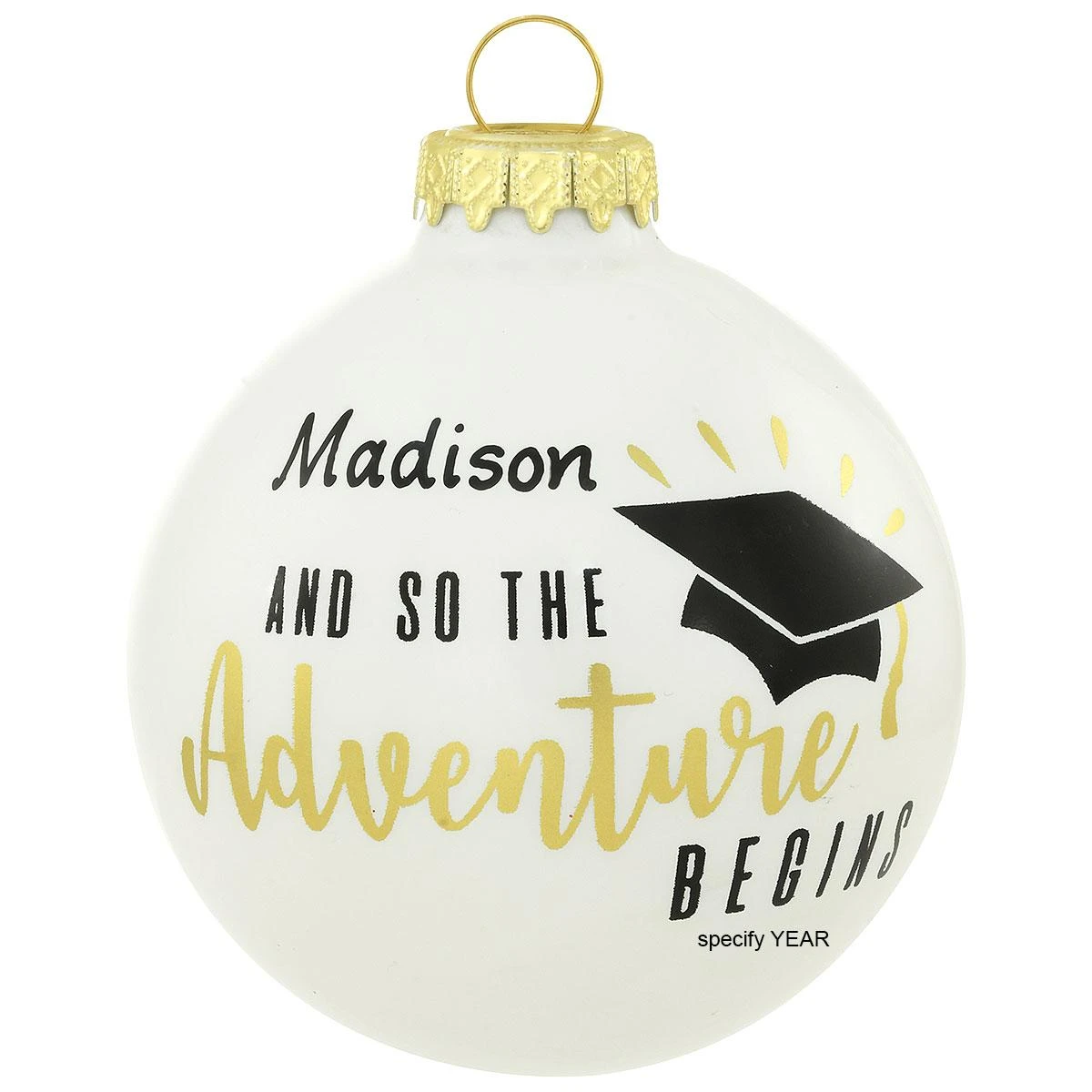 Celebrating the completion of studies, commencement is not the end but rather, the beginning of a new adventure! Exclusively crafted for Bronner’s from glass in Hungary, this 3″ white opal ornament showcases the sentiment AND SO THE Adventure BEGINS along with a black grad cap with shiny gold accents and makes a great gift for the new grad. Allow one of our professional Bronner’s artists to add a personal touch with a black paint pen at no additional charge.