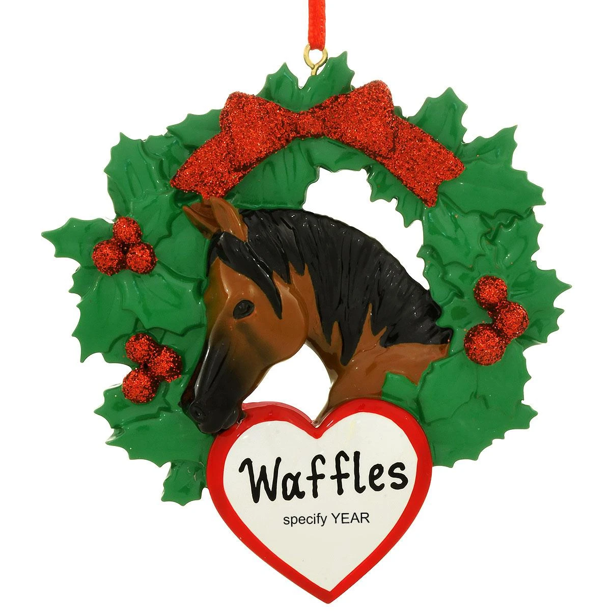 We’ve decked the HORSE with boughs of holly! Our charming equestrian design features the head of a magnificent brown and black horse encircled in a festive wreath of holly leaves and glittering red berries. 3¾” resin ornament comes ready to hang on a red ribbon.