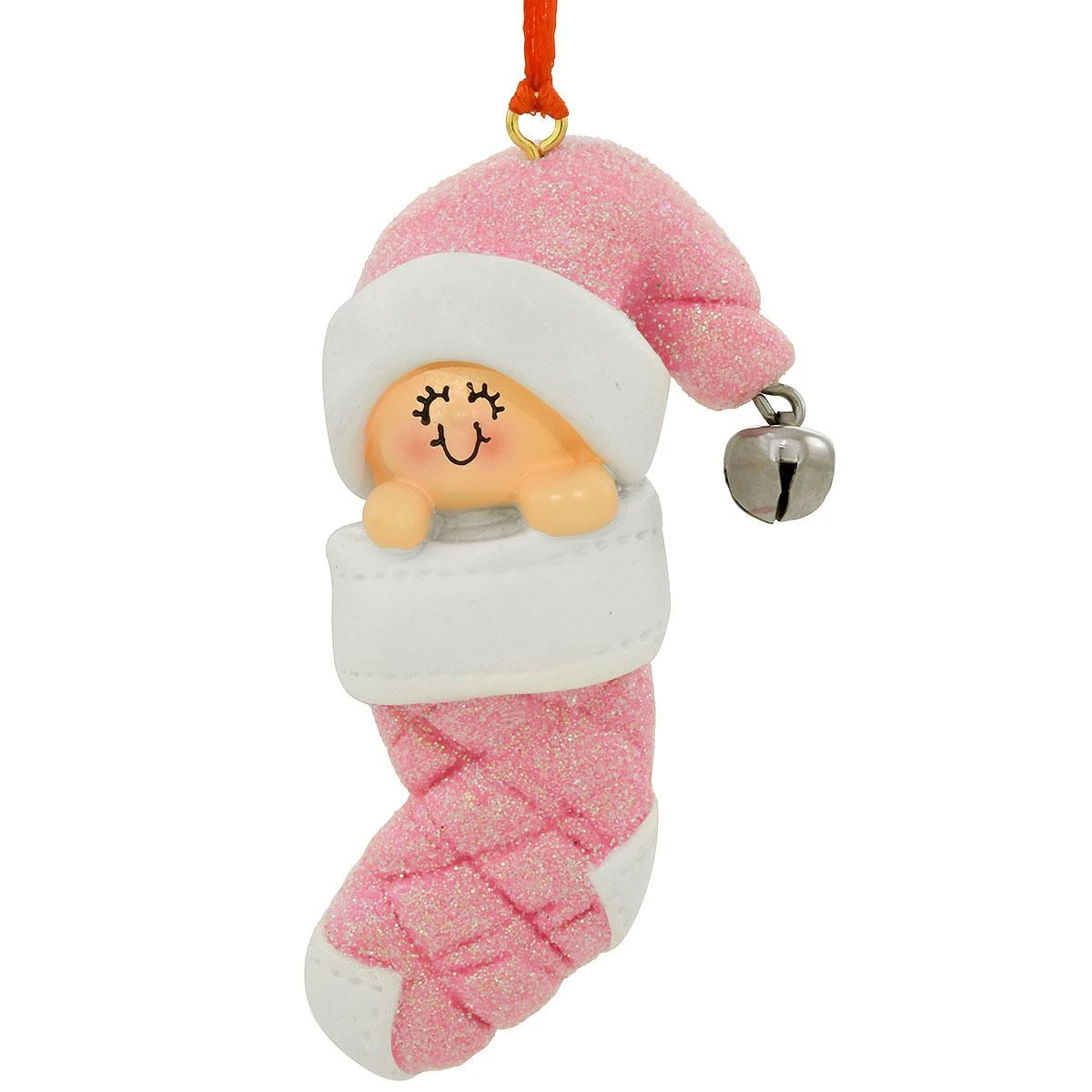 This little pink stocking holds a bundle of joy and precious memories of baby’s first year. Crafted of resin, our 3¼” baby in stocking ornament features an adorable girl smiling broadly in a pink hat with silver jingle bell. Embellished with shimmering pink glitter, this whimsical keepsake comes ready to hang on a red ribbon and is a perfect memento for baby’s first Christmas.