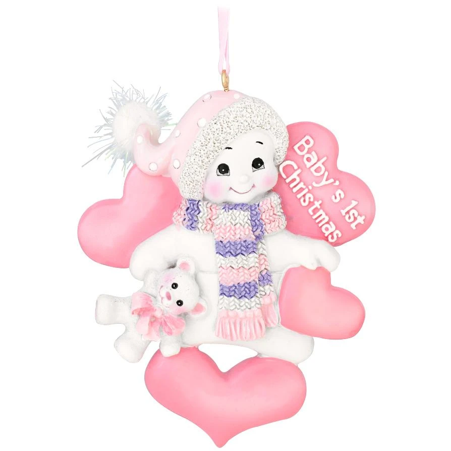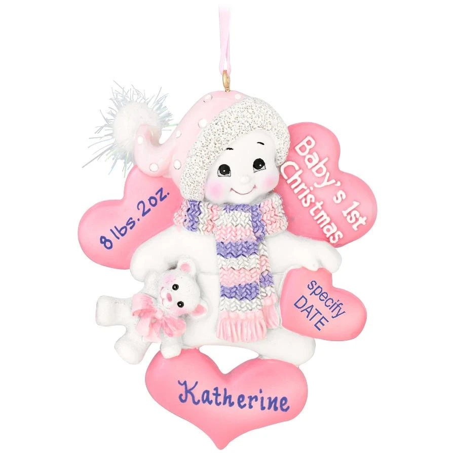 Hearts filled with special information create a loving keepsake for a baby’s first Christmas celebration! Personalized with a purple paint pen by our professional Bronner’s artists at no additional charge, our baby ornament comes ready to hang with a pink ribbon. This personalized baby’s 1st Christmas pink snowman with hearts ornament is 4″ tall and crafted of resin.