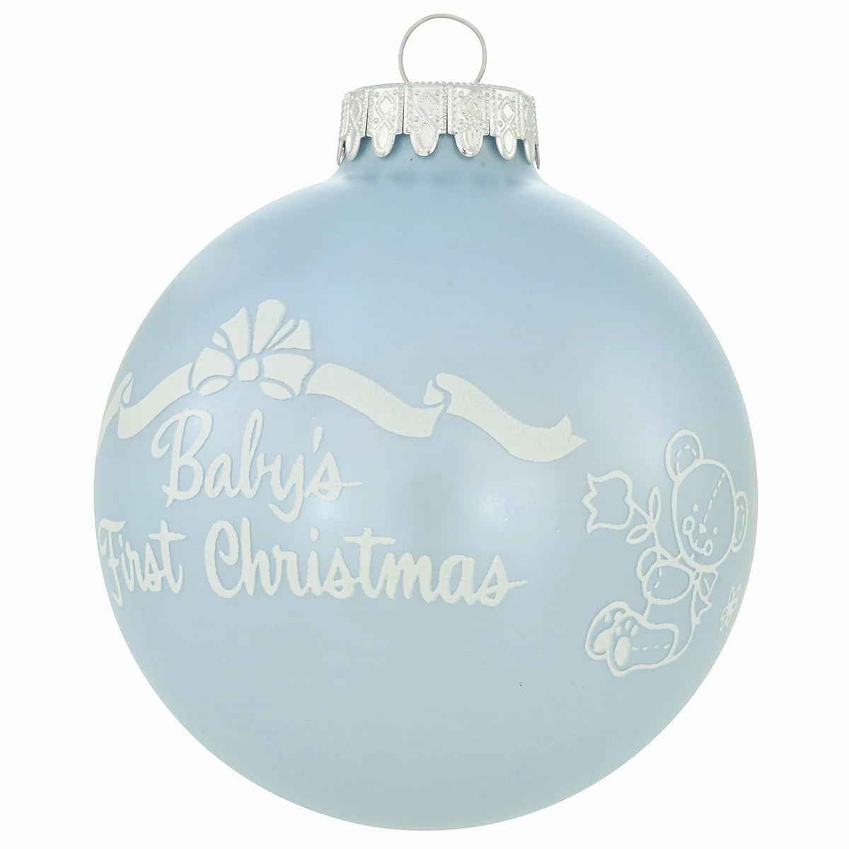 Celebrate the 1st Christmas of the newest member of the family with this special keepsake for the precious baby boy. Crafted exclusively for Bronner’s from glass in Hungary, our 4″ tall ornament features a light blue glossy surface with cute nursery designs in white depicting a bunny, teddy, bear and jack-in-the-box. Adorned with the sentiment Baby’s First Christmas, this unique baby’s first Christmas glossy blue ornament will make an ideal gift to welcome the new little bundle of joy. Allow one of our talented Bronner’s artists to hand-paint a personalized touch with stunning white paint at no additional charge.