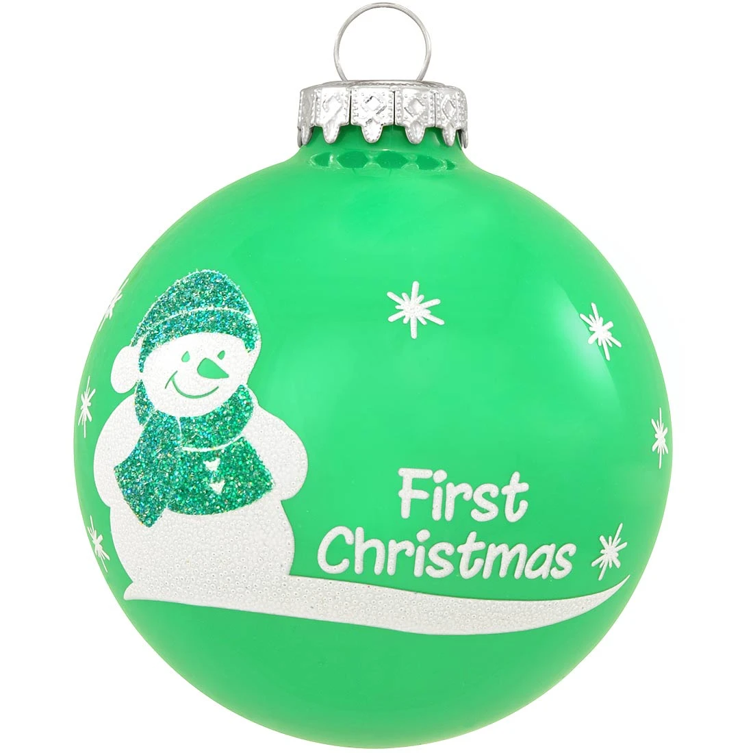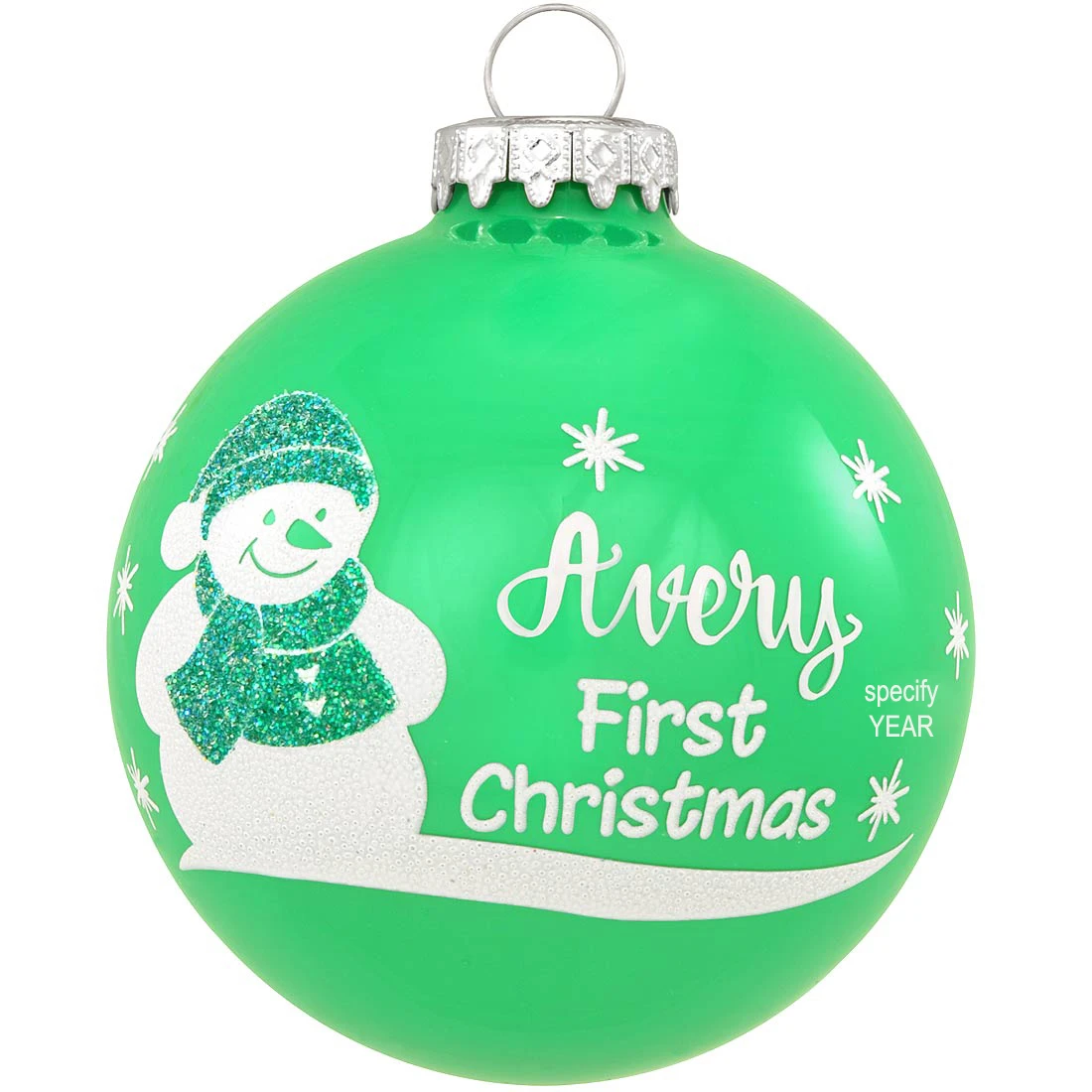 Pictures and keepsakes will help to keep baby’s experiences a close memory throughout the years as your little bundle of joy grows! Exclusively crafted for Bronner’s from glass in Hungary, our 3″ tall ornament decorates the opal green surface with a glittering snowman amongst a snowfall and the words “First Christmas” in vivid white enamel. Allowing one of our talented Bronner’s artists to hand-paint a personalized touch with white paint at no additional charge to our personalized baby’s first Christmas green glass ornament is a wonderful way to celebrate and commemorate the special occasion while creating a sentimental heirloom he or she will be honored to receive.