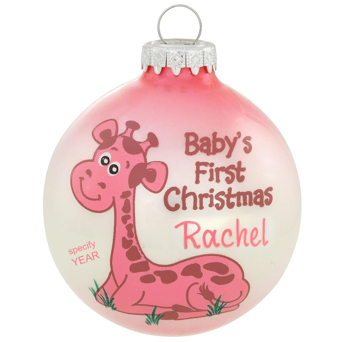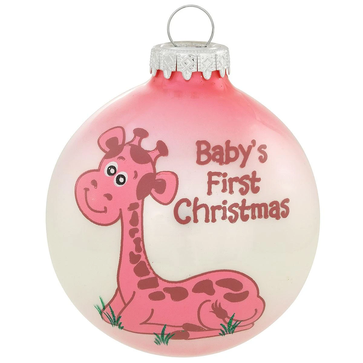 Commemorating baby’s first Christmas is a tall task, and this adorable keepsake is up for the special occasion! Skillfully crafted of glass in Hungary exclusively for Bronner’s, our 3″ round ornament has a shimmering two-tone pink and white surface adorned with a darling baby giraffe resting in glittery green blades of grass. Featuring the sentiment Baby’s First Christmas, this special keepsake can be personalized by one of our talented Bronner’s artists using a pink paint pen at no additional charge.