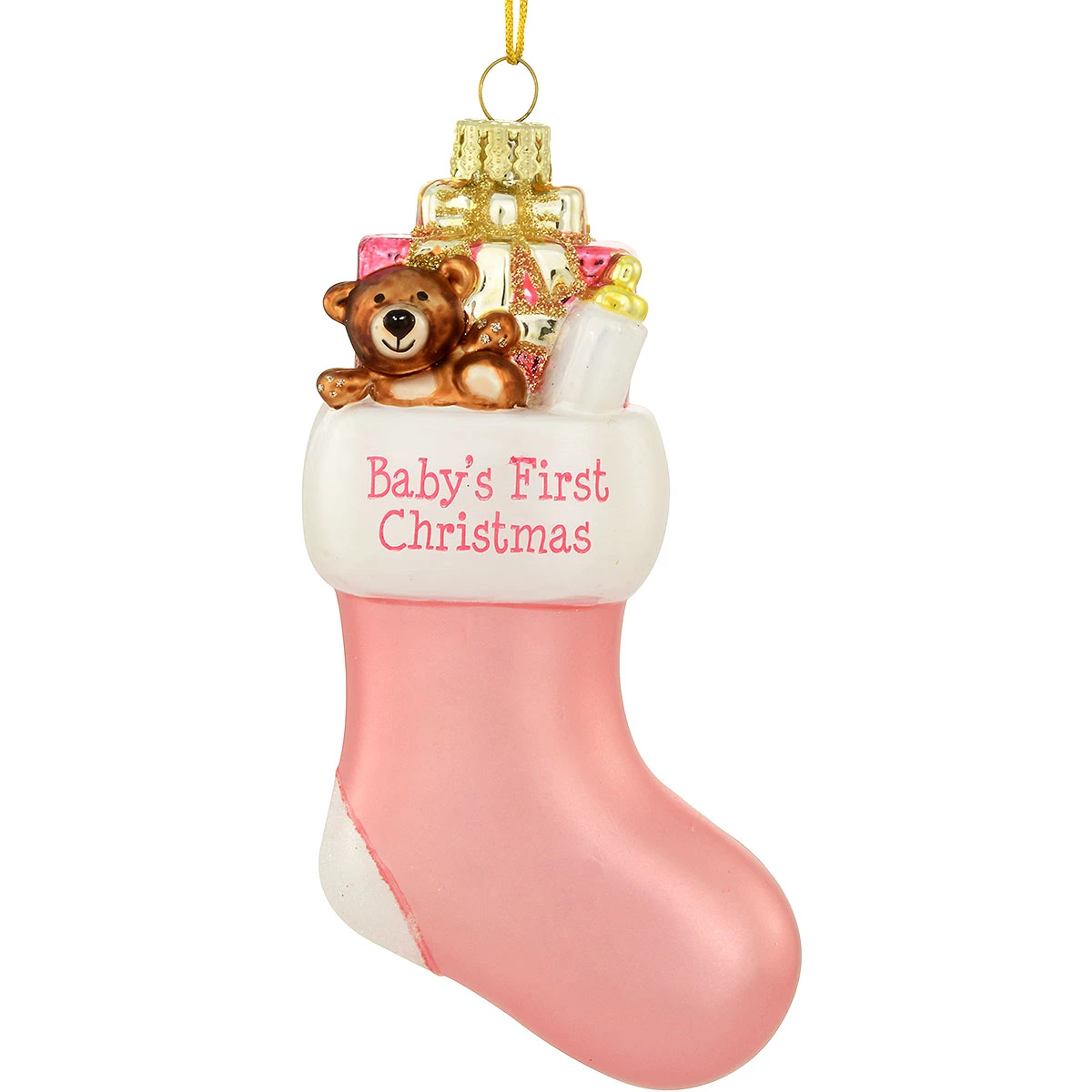 “Stuffed” with a cute teddy bear, bottle and festively wrapped gift, this adorable 4¾” tall baby’s first Christmas pink stocking glass ornament is sure to become a treasured family keepsake! With sparkling glitter accents and featuring the sentiment Baby’s First Christmas on its gleaming white cuff, our delightful pink stocking ornament is crafted exclusively for Bronner’s. Coming ready to hang with a gold cord, this charming stocking ornament has a hanging height of 5″. For a unique touch of personal-ityâ„¢, allow one of our talented Bronner’s artists to hand-paint a personalized touch in white paint at no additional charge.