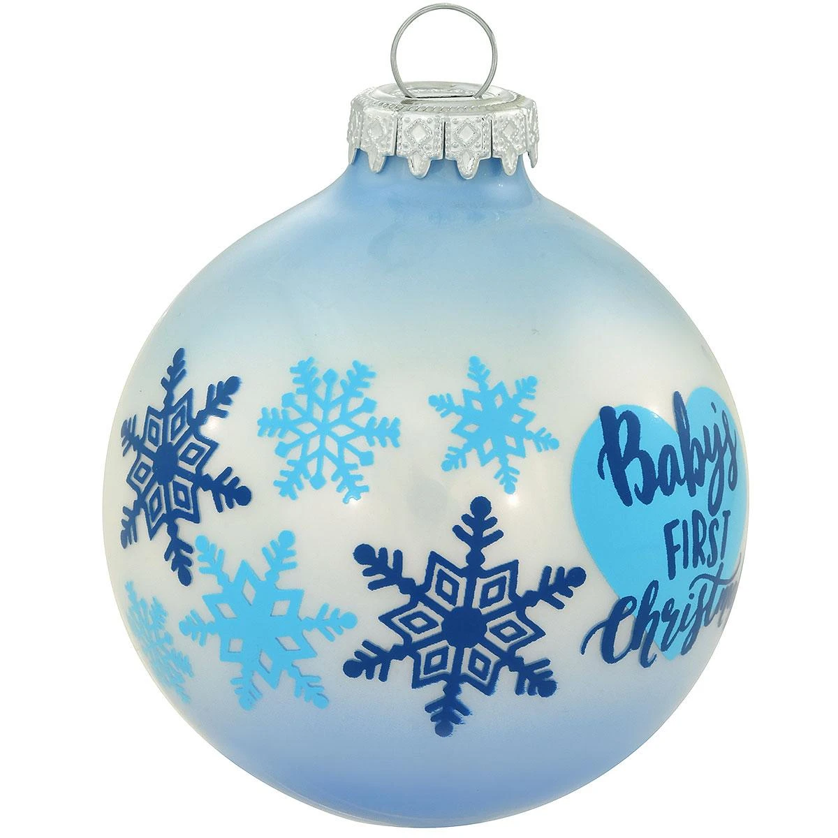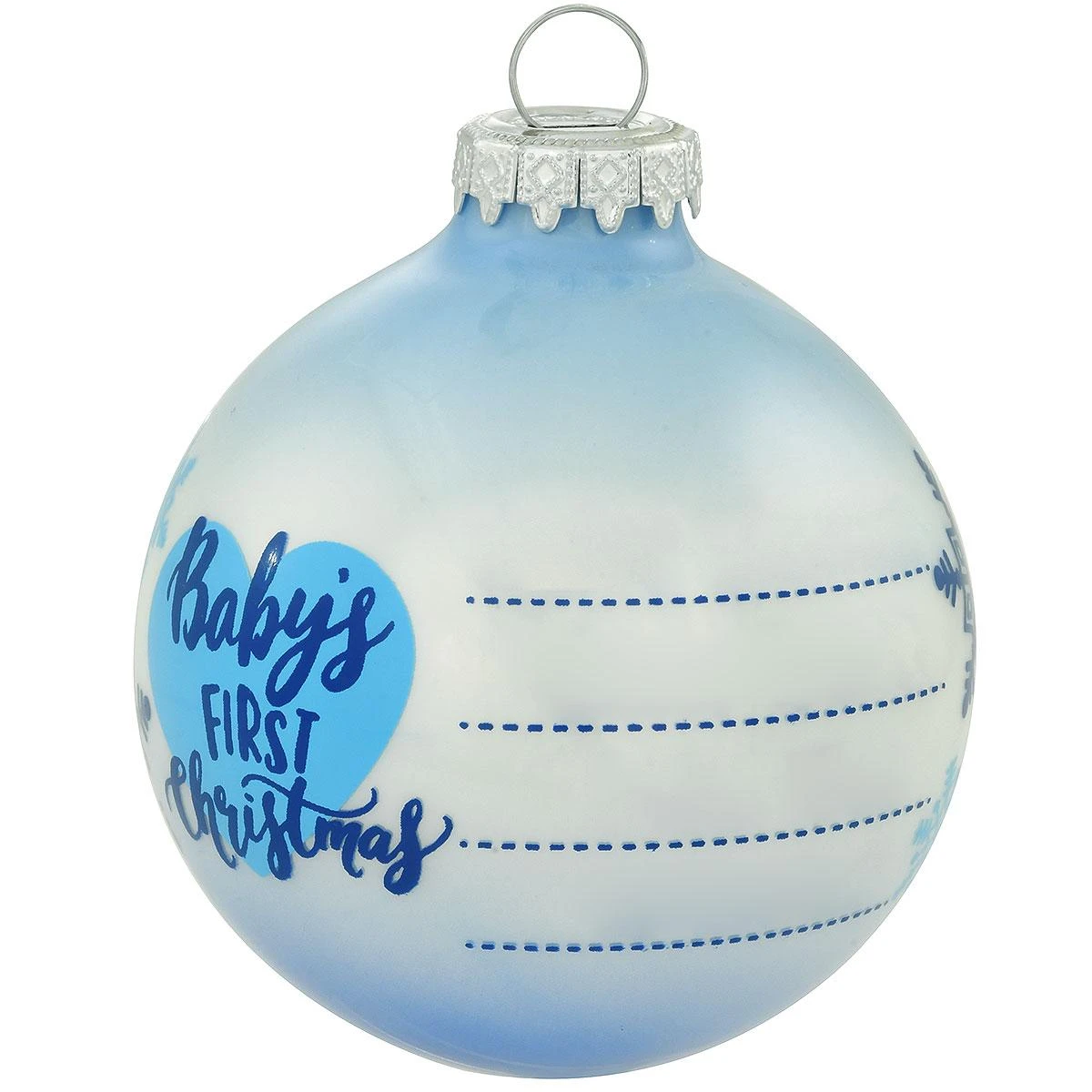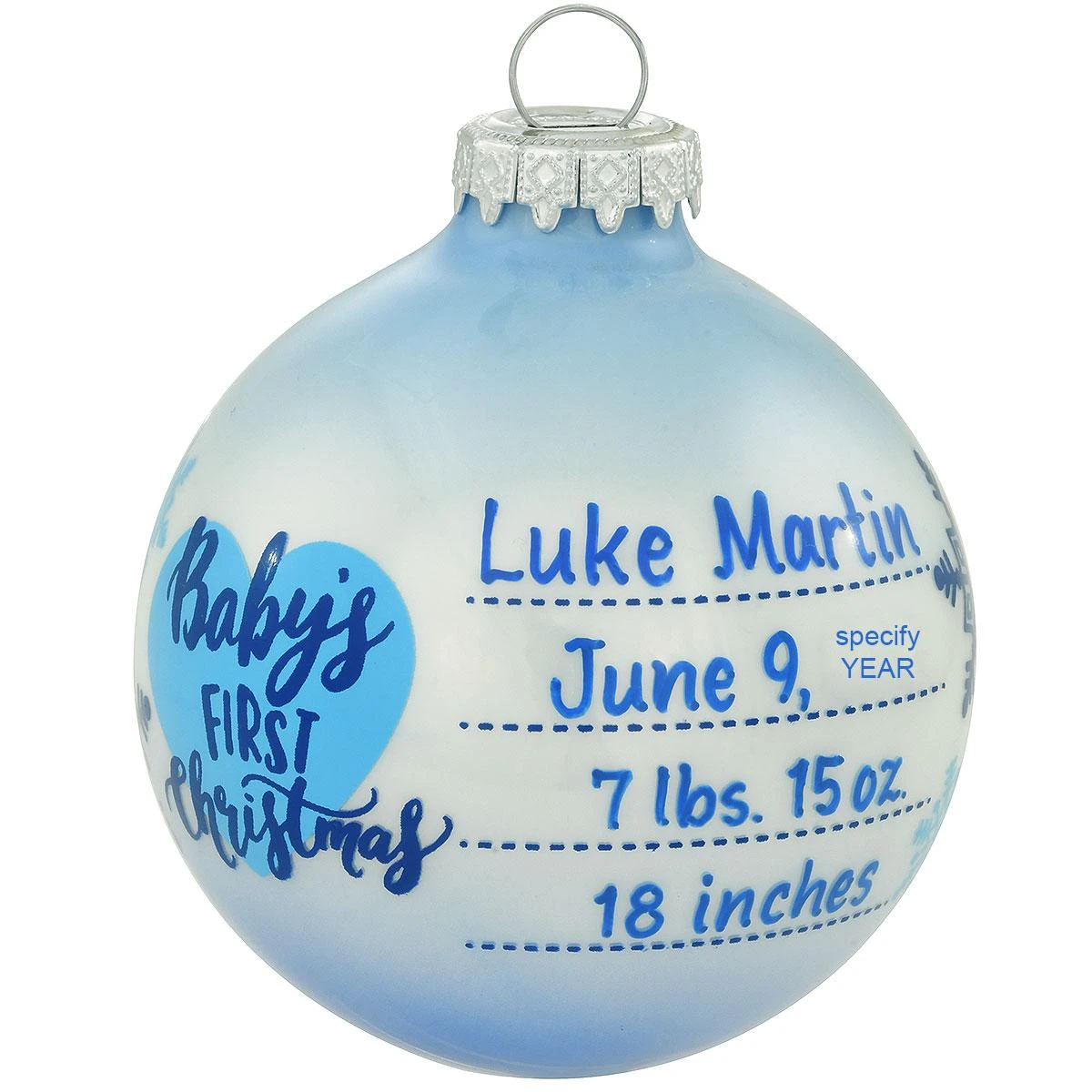 Every child is a special blessing from God and is as wonderfully unique as a snowflake! Celebrate the birth of the new little boy with a personalized gift for the family tree! Artfully crafted of glass in Hungary, our 3-tone blue and pearl design features special spots for baby’s unique birth stats and comes complete with a blue heart and the sentiment Baby’s First Christmas. Encircled with a flurry of shimmering blue snowflakes, this 3″ Bronner’s exclusive keepsake can be personalized by one of our talented Bronner’s artists with a blue paint pen at no additional charge!
