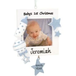 A picture perfect gift for a precious new baby boy, our white and blue resin photo frame ornament is adorned with a cute bottle, rattle and star motif and the sentiment Baby’s 1st Christmas. Designed to display an approximate 2¼” tall x 2½” wide photograph, this adorable keepsake comes ready to hang with a blue ribbon and has a hanging of 5″ (including its dangling star charm.) Allow one of Bronner’s talented artists to personalize this keepsake with a black paint pen at no additional charge.