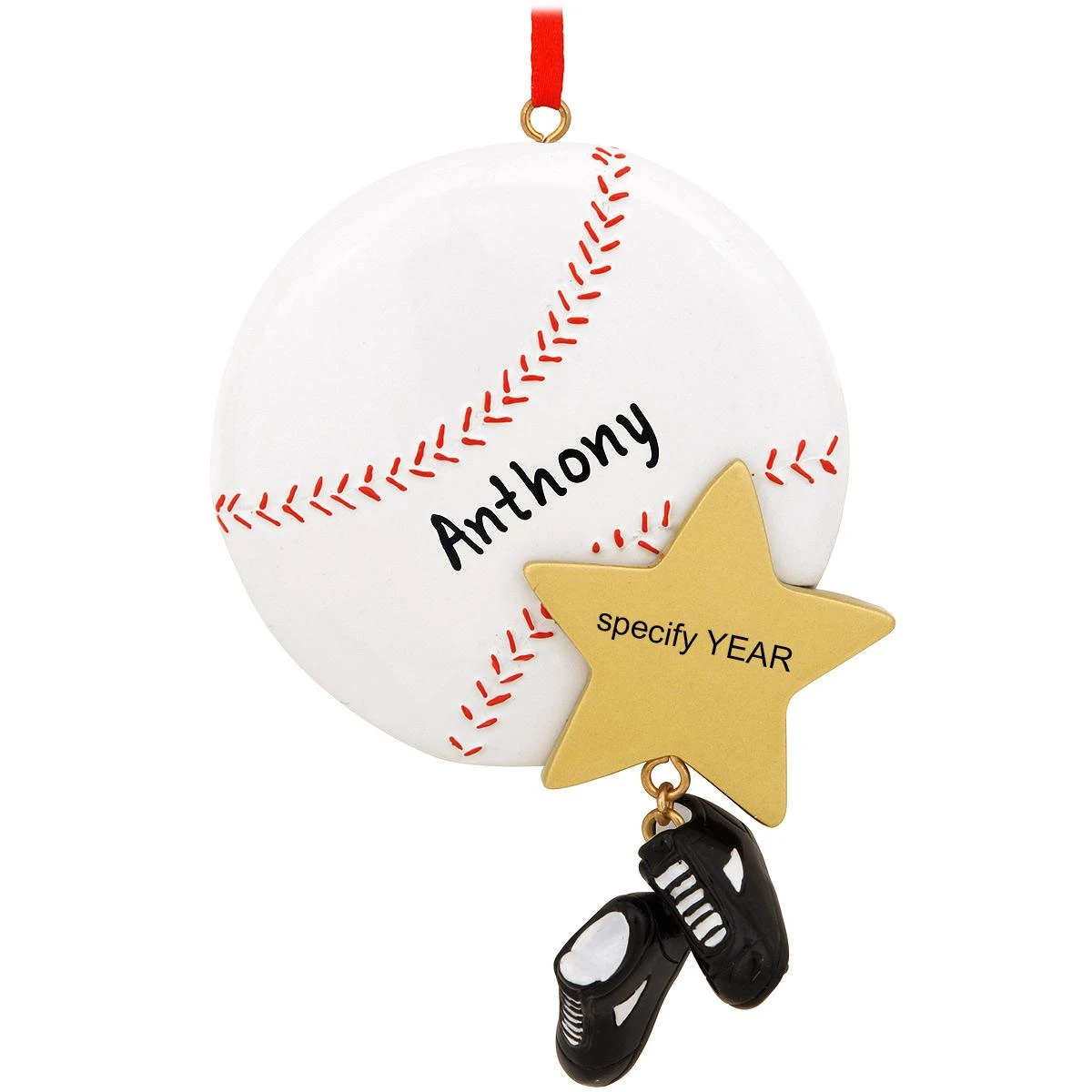 Score a gold star in the heart of your baseball fan with this adorable sports ornament! Personalized with a black paint pen by our professional Bronner’s artists at no additional charge, this 4½” tall resin ornament features a realistic baseball with a shiny gold star and dangling black baseball shoes. This unique baseball star with shoe dangle ornament comes ready to hang with a red ribbon.