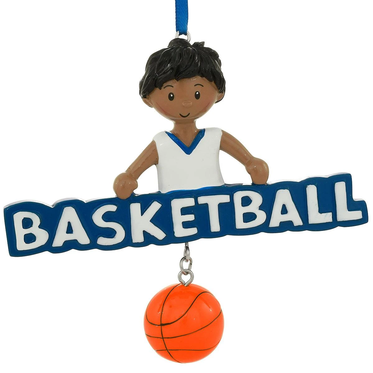 Dribble up some holiday excitement with this unique personalized gift! Artfully detailed in resin, our handsome basketball themed ornament features a smiling African American boy in uniform above the word “BASKETBALL” and sports a dangling ball charm. Artfully hand painted with vivid red, white, brown, and yellow glazes, 4¼” tall ornament comes ready to hang with a red ribbon. Why not allow Bronner’s to add a touch of personal-ity™ with a black paint pen at no additional charge.