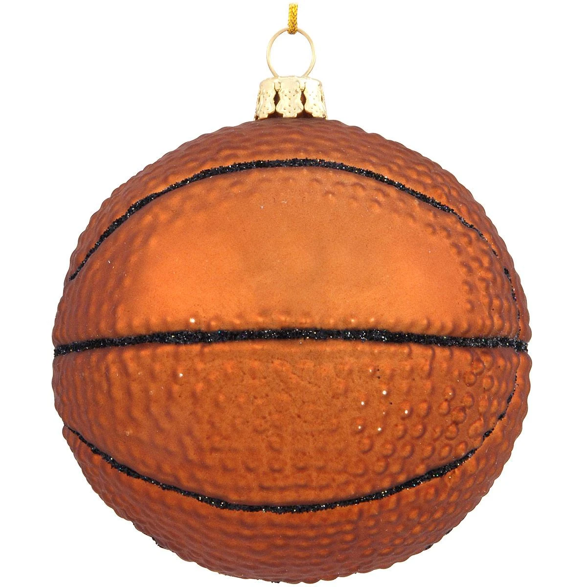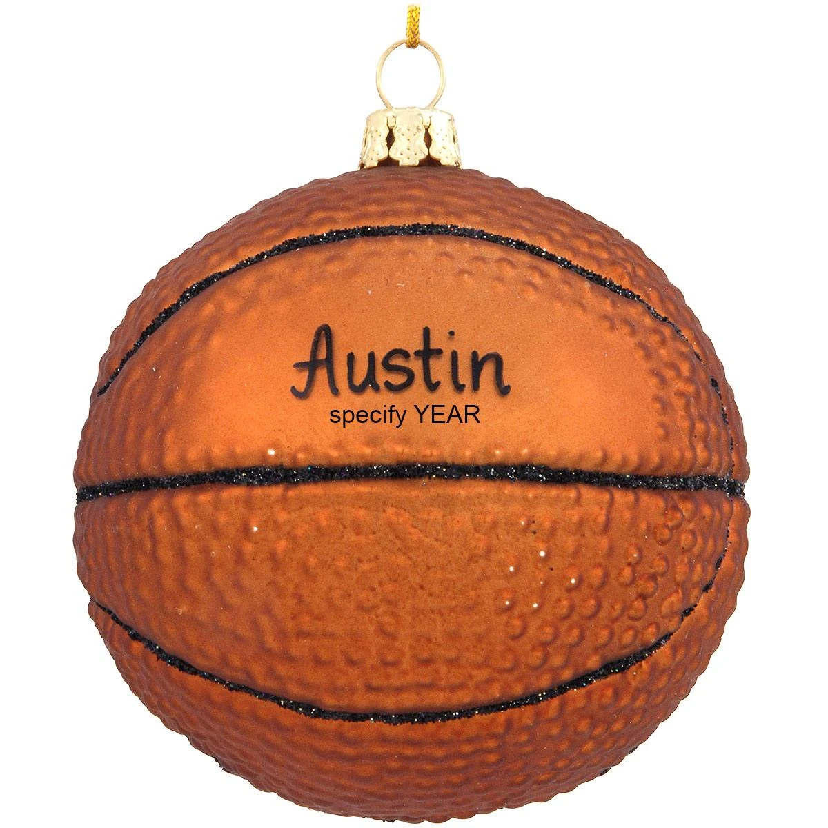 Dribble up some holiday excitement for your basketball player or fan with this sport-ing keepsake! Exclusively crafted of glass for Bronner’s, our 3″ round basketball has a leather-like appearance painted with vibrant orange glazes and sparkling glitter accents. Coming ready to hang with a gold cord, this charming ornament can be personalized by one of our talented Bronner’s artists with a black paint pen at no additional charge.