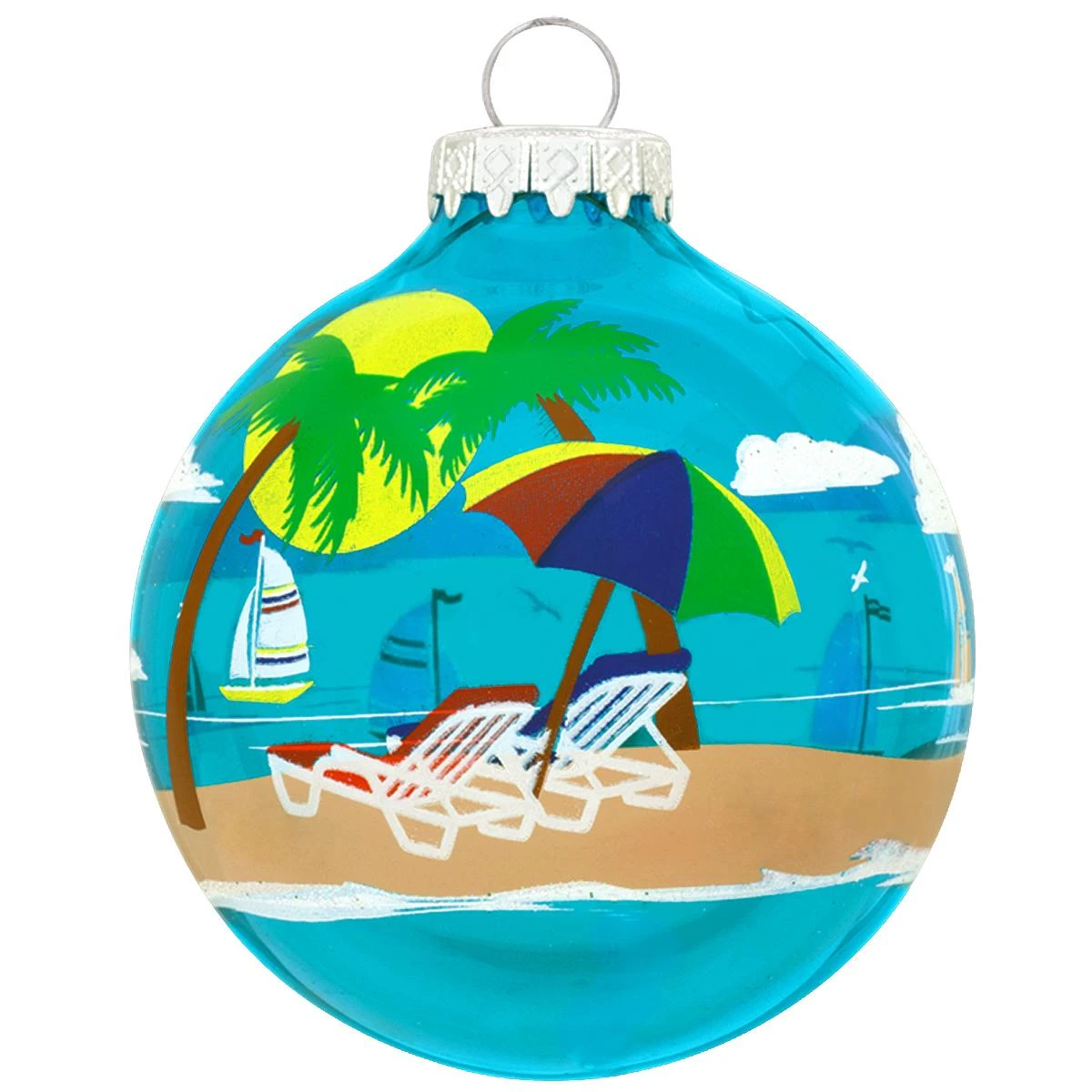 Commemorate a special vacation, future destination, or simply add some beach fun to your Christmas tree with our colorful personalized beach scene ornament! Crafted of glass exclusively for Bronner’s from Hungary, this vibrant 3″ tall keepsake depicts a pair of beach chairs under the shade of an umbrella with majestic palms and a spectacular ocean view. Allow one of our professional Bronner’s artists to add a personal touch with a dark blue paint pen at no additional charge.