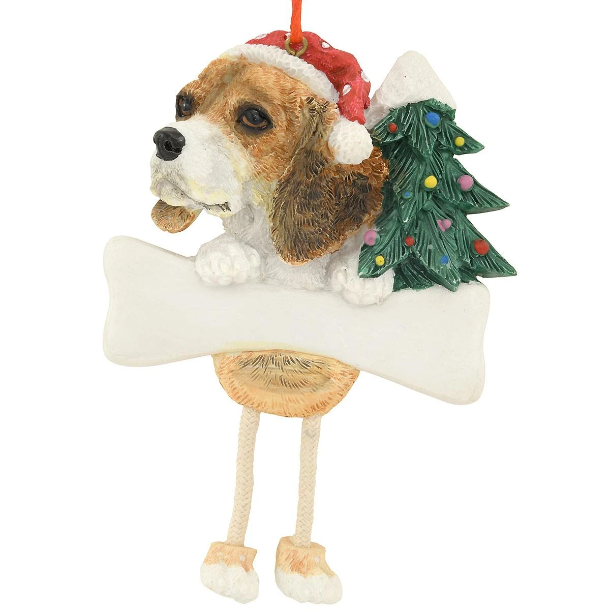Throw your dog a well-deserved bone with this fetching holiday treat! Proudly clutching a delectable bone, our adorable brown beagle grins happily in a Santa hat beside a miniature Christmas tree. Crafted of resin with playful dangling yarn legs, this dog-gone cute 4½” tall ornament is hand-painted with colorful glazes and comes ready to hang with a red ribbon. For a personal touch, allow one of our talented Bronner’s artists to add your pooch’s name in black paint pen at no additional charge.