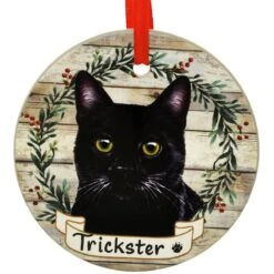 Celebrate the cat that’s part of the family circle! Our black cat round ceramic ornament features a portrait of an adorable feline framed within a festive wreath. Coming ready to display on a red ribbon, this 3½” ornament also makes a wonderful memorial of a special pet.