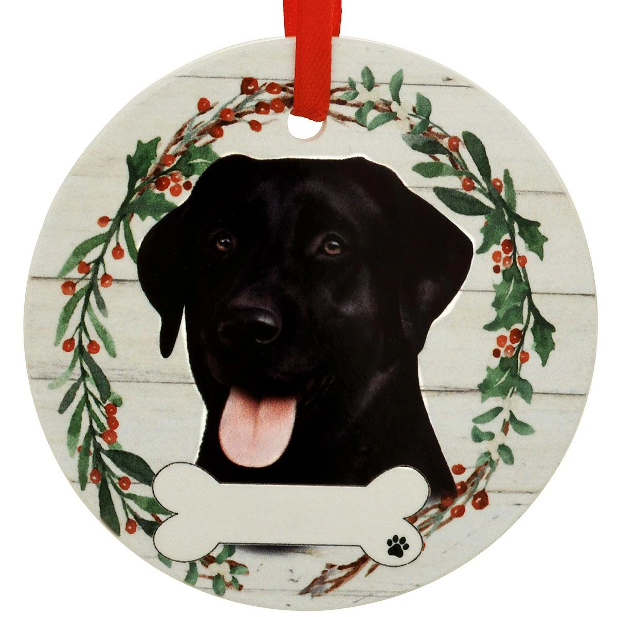 Celebrate the pooch that’s part of the family circle! Our Black Lab round ceramic ornament features a portrait of an adorable dog framed within a festive wreath. Coming ready to display on a red ribbon, this 3½” ornament also makes a wonderful memorial of a special pet.