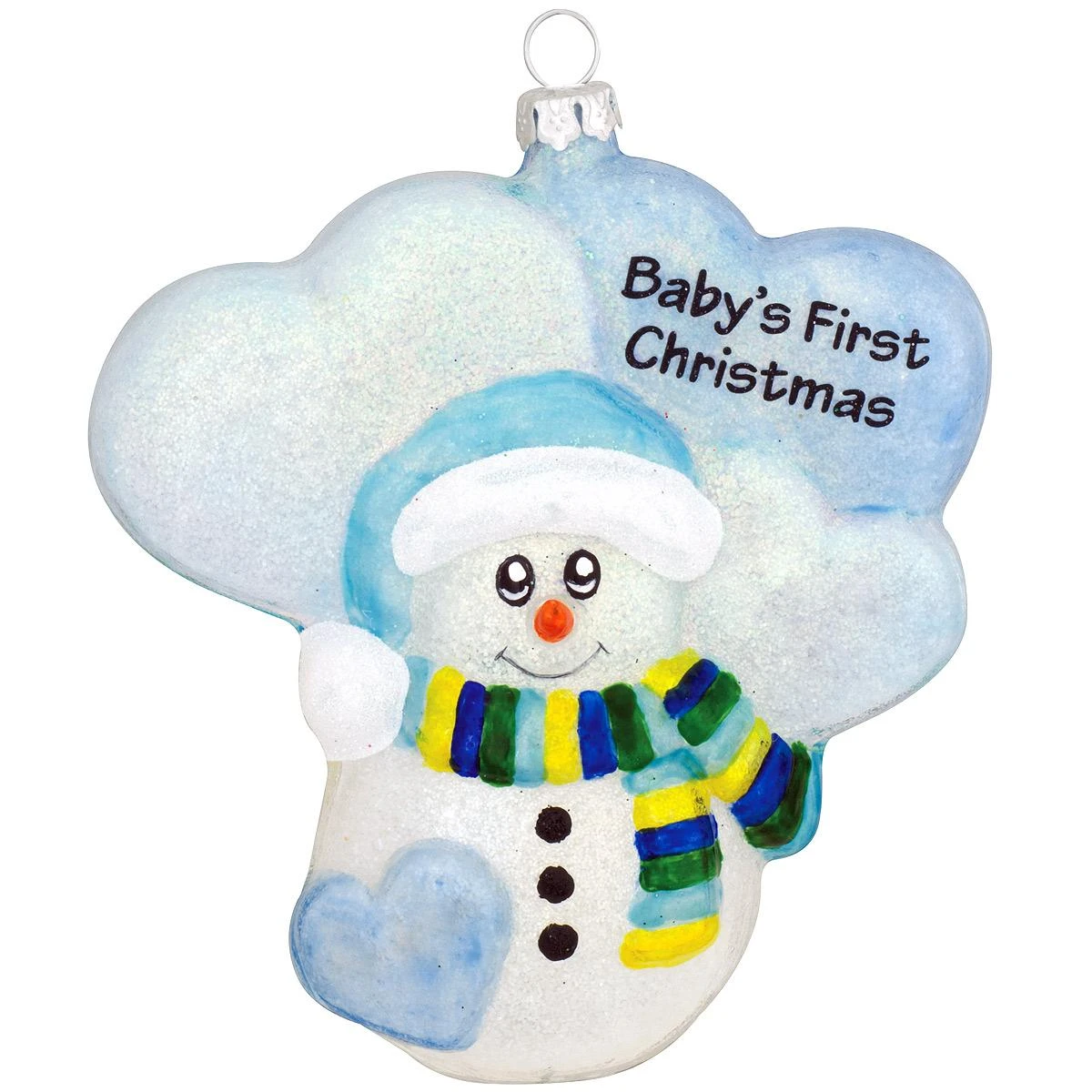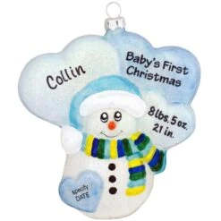 Mark the occasion of your baby’s first Christmas with this adorable personalized keepsake! Artfully crafted of glass with an interior coating of sparkling iridescent glitter exclusively for Bronner’s, our blue snowman ornament measures 4″ tall and comes complete with the sentiment Baby’s First Christmas. Allow one of our talented Bronner’s artists to add a personalized touch for that special baby boy by adding his unique name and birth stats with a black paint pen at no additional charge.