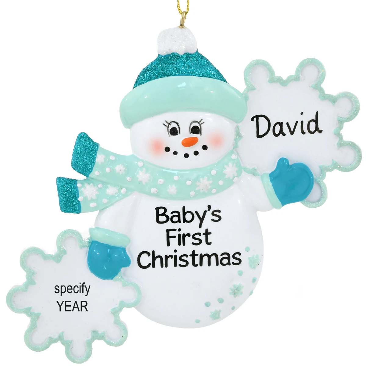 Please select the alternate image for a view of this baby’s first Christmas snowman with snowflakes blue ornament without personalization.