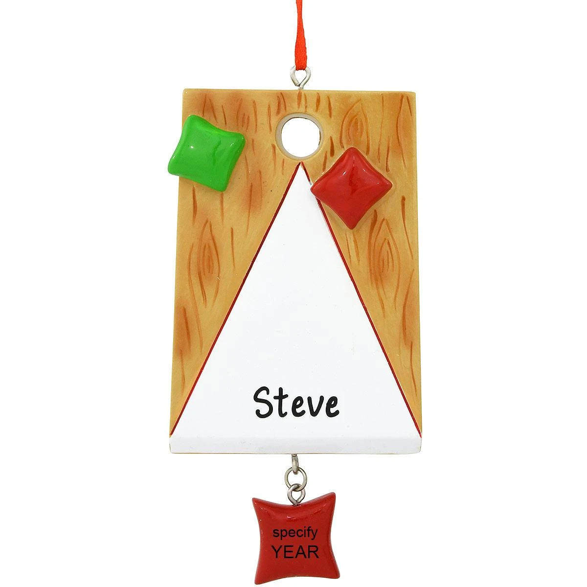 You’ll be ahead of the game when you toss this special keepsake on the tree! Perfect for the corn hole champ amongst friends and family, this fun resin ornament depicts a wooden corn hole board with opposing red and green bags landing in close competition. Accented with a dangling red corn hole bag, this unique 4¾” keepsake comes ready to hang with a red ribbon and can be personalized by one of our talented Bronner’s artists with a black paint pen at no additional charge.