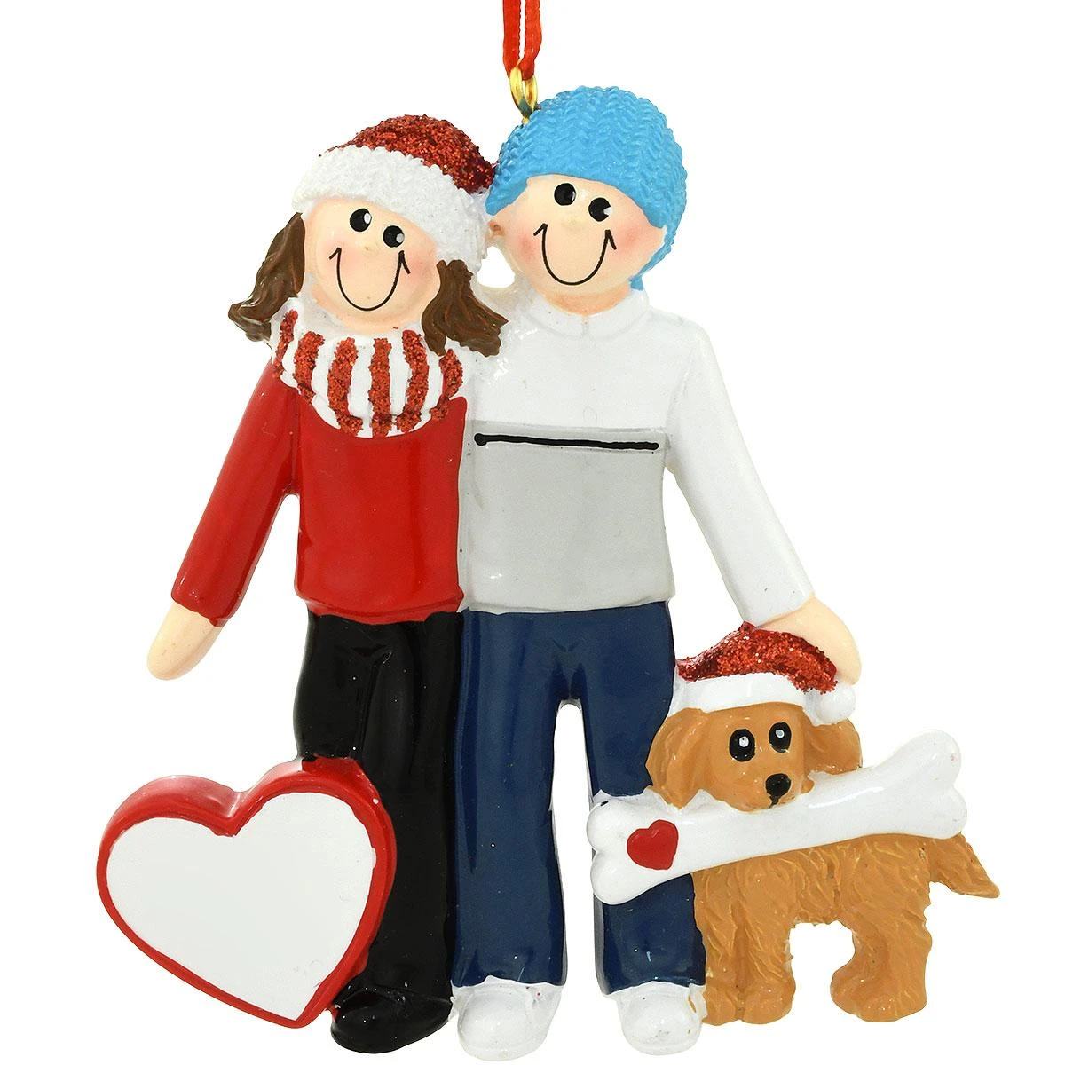 Our happy couple is starting the season on the right paw by including their “fur baby” in their holiday plans! All are dressed in festive winter caps while the pup enjoys a giant bone. Adorned with a large heart and touches of sparkling red glitter, our 3¾” couple with dog ornament comes ready to hang with a red ribbon. For a unique gift with personal-ityâ„¢, why not allow one of our professional Bronner’s artists to personalize this keepsake with a black paint pen at no additional charge?