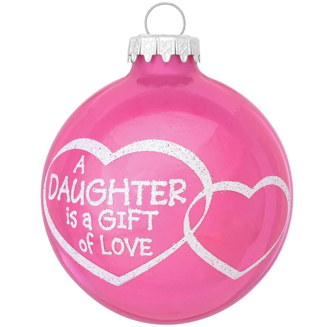 Cherish your daughter by commemorating your love with our fuchsia glass ornament! Measuring 3″ tall and exclusively crafted in Hungary for Bronner’s, our personalized daughter is a gift of love glass ornament is designed with interlocking hearts and accented in iridescent glitter. This pearlescent fuchsia ornament features the sweet sentiment A Daughter is a Gift of Love, and is perfect for a touch of personal-izationâ„¢ with a white paint pen by one of our professional Bronner’s artists at no additional charge. This unique keepsake is sure to make a heart-felt addition to the tree and a loving heirloom to pass down!
