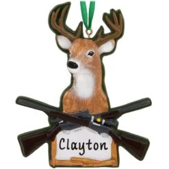 Scope out this great gift for your deer hunter’s tree! With an impressive trophy buck centered above pair of crossed rifles, this handsome 4¼” tall ornament is artfully crafted of resin in natural tones of tan, brown, white, and green. Coming ready to hang with a green cord, our attractive hunting-themed keepsake can be personalized by one of our talented Bronner’s artists using a black paint pen at no additional charge.