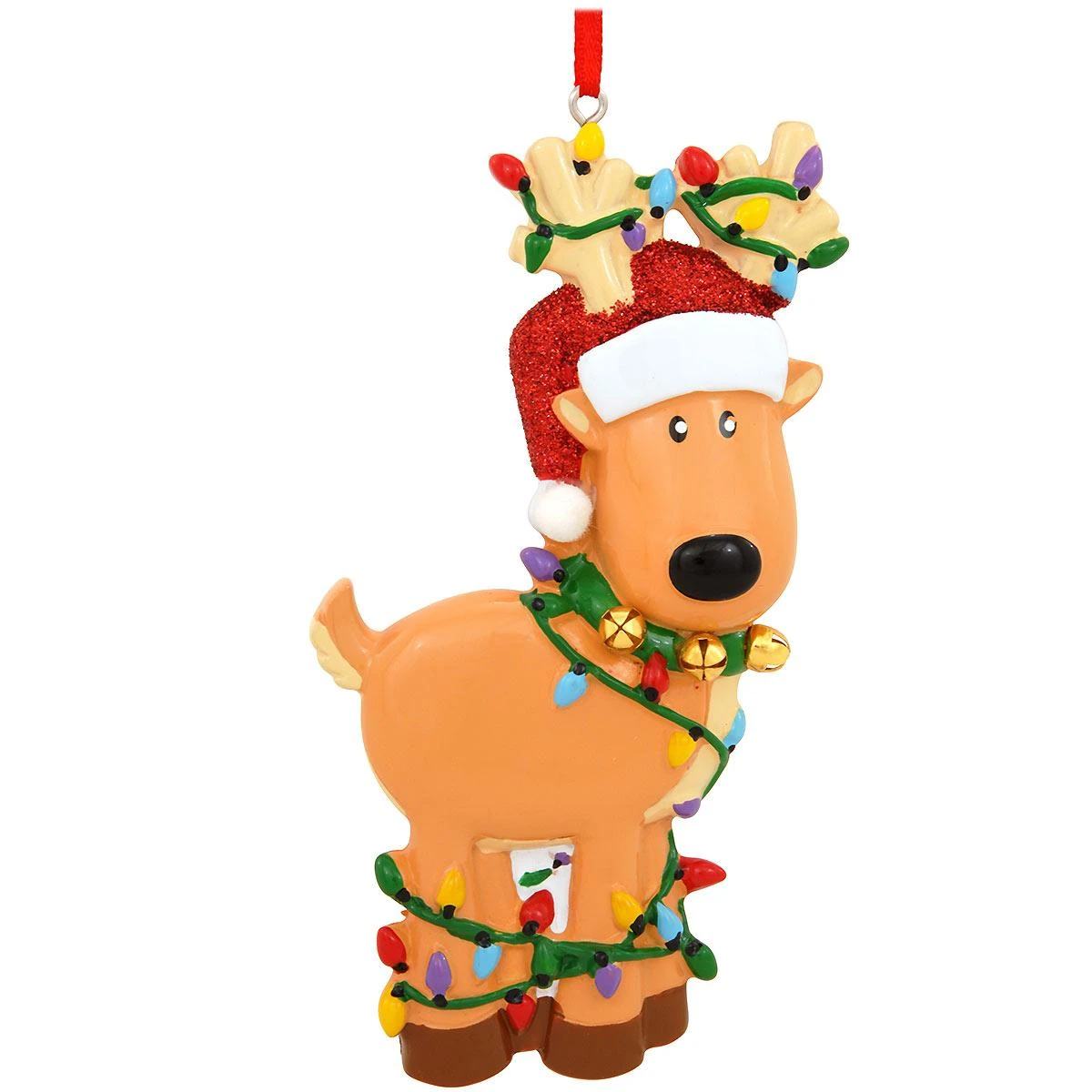 Display your holiday spirit with this deer little creature! Artfully crafted of resin, our cute reindeer wears a Santa hat and jingle bell collar and is tangled in a string of lights. Coming ready to hang with a red ribbon, this 4¾” tall keepsake is perfect for your deer-est friends and family when you allow one of our talented Bronner’s artists to add a personalized touch with black paint pen at no additional charge.