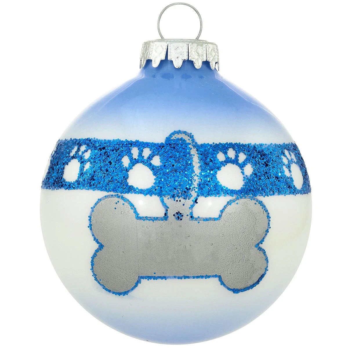 When you’re making up your gift list, don’t forget to collar a fun gift for the four-legged member of your family! Depicting a bone-shaped dog tag hanging from a glittery blue collar decorated with paw prints, this fetching 3″ round glass ornament has a shimmering two-tone blue and pearl surface and is crafted in Hungary exclusively for Bronner’s. Add a touch of your pooch’s personal-ityâ„¢ by allowing one of our talented Bronner’s artists to add a name with a black paint pen at no additional charge.