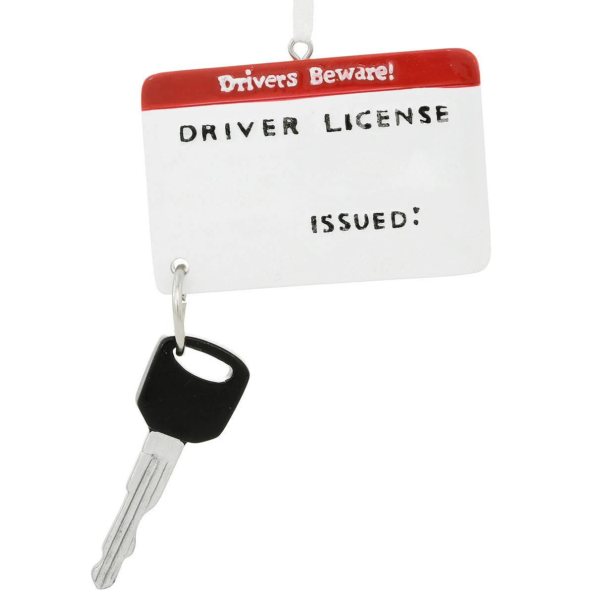 Oh happy day…Guess who passed his test at the DMV! Artfully detailed in resin, this unique ornament features a gleaming new driver’s license adorned with the caption Drivers Beware! Adorned with a jingling car key accent, this awesome keepsake will make a great gift for the new driver among your family and friends! Coming ready to hang with a white ribbon, this special key-psake ornament has a hanging height of approximately 4¼” tall. Allow one of our professional Bronner’s artists to add a personal touch with a black paint pen at no additional charge.