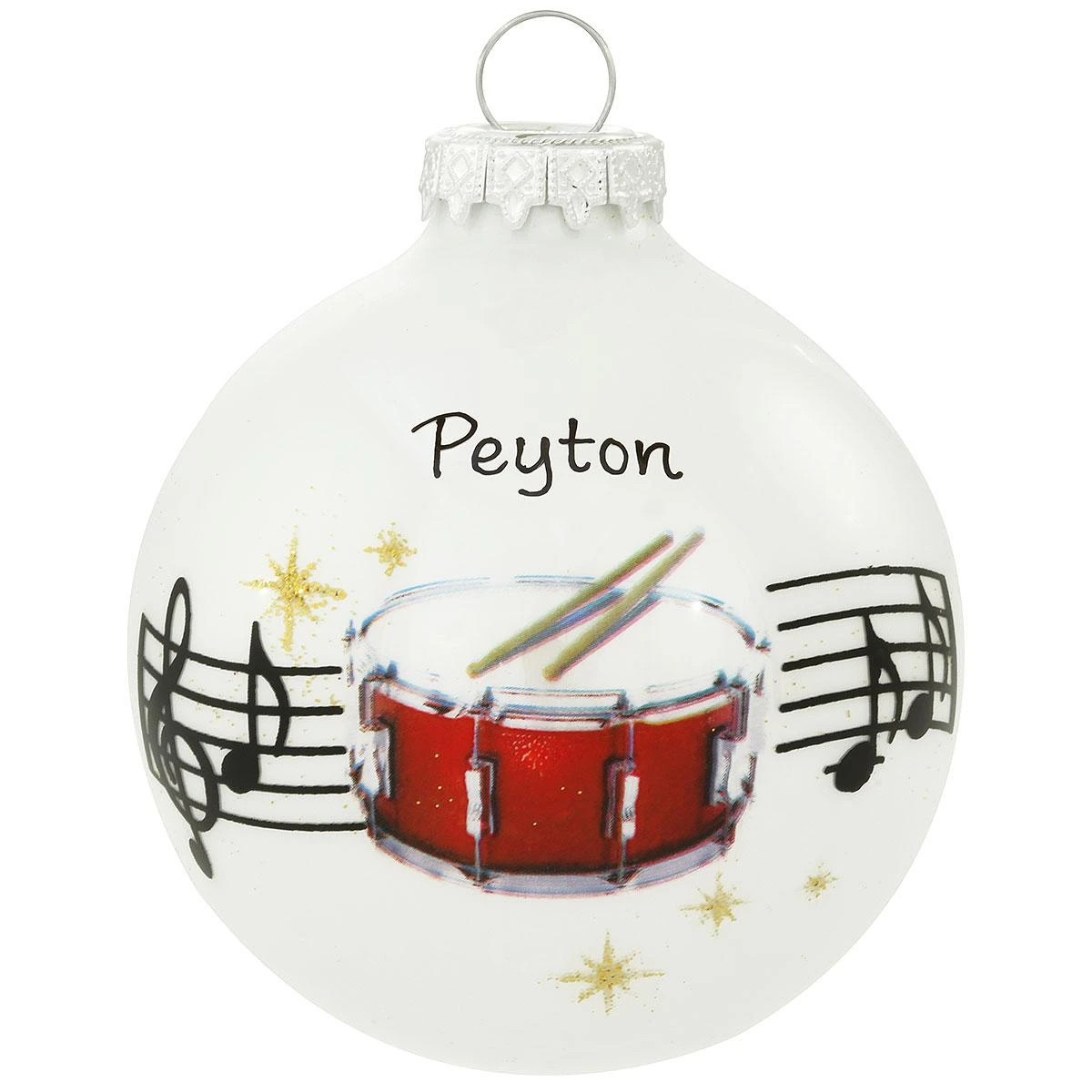 Add a merry melody to your music lover’s tree with this note-worthy design! Shimmering with opalescent glazes, our 3″ round ornament features a drum with sticks and flowing music staff surrounded by glittery gold stars. Artfully crafted of glass in Hungary, this Bronner’s exclusive design is sure to perform brilliantly for many years to come when you allow one of our talented Bronner’s artists to add the name of your choice with a black paint pen at no additional charge.