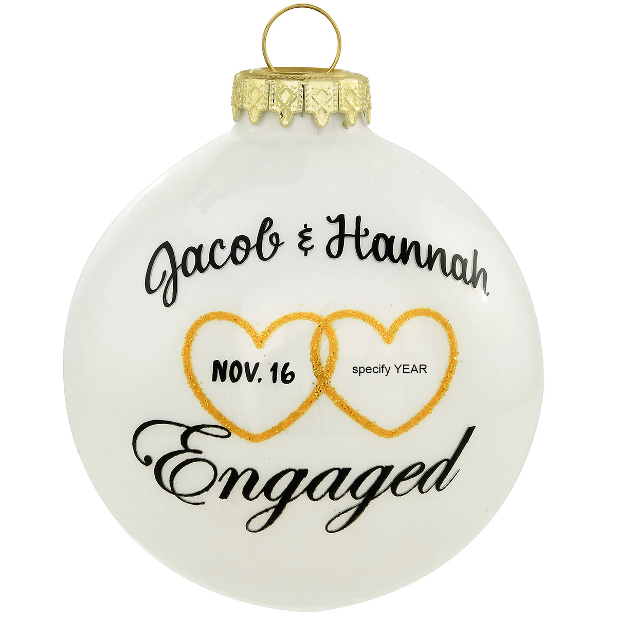 He asked…and she said “Yes!” The marriage proposal has been made and accepted, now it’s time to celebrate the joyous occasion with a special personalized keepsake for the newly engaged couple! Crafted of glass exclusively for Bronner’s from Hungary, this 3″ round ornament features two gold hearts and the word “Engaged” appearing in an elegant black font along a shimmering, white opal surface. Allow one of our professional Bronner’s artists to hand-paint a personalized touch with black paint at no additional charge.