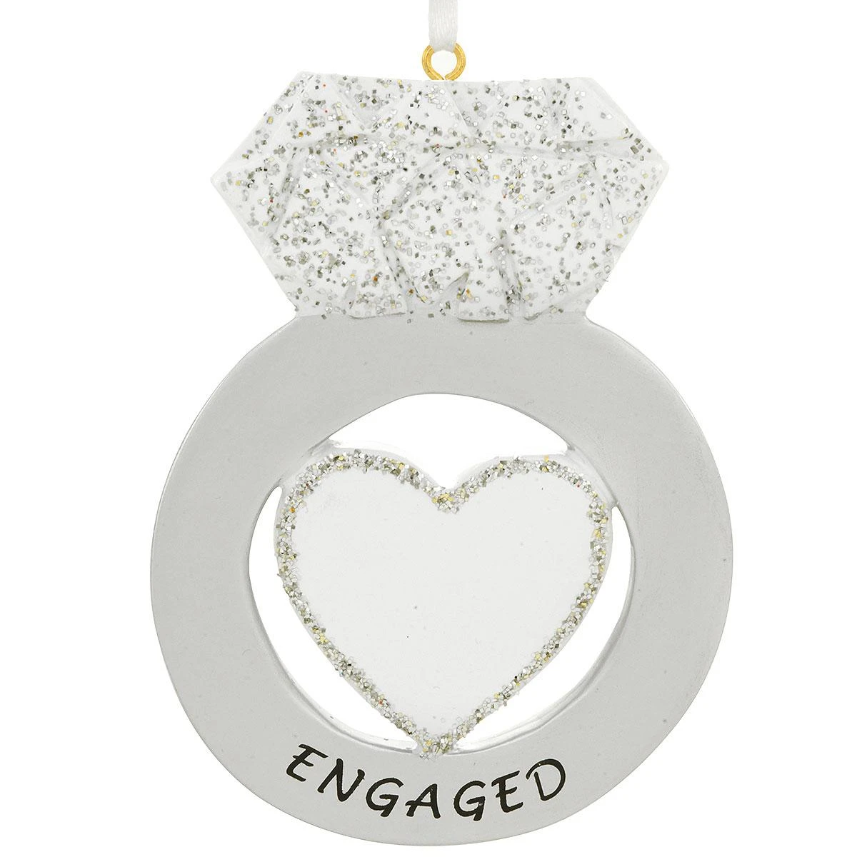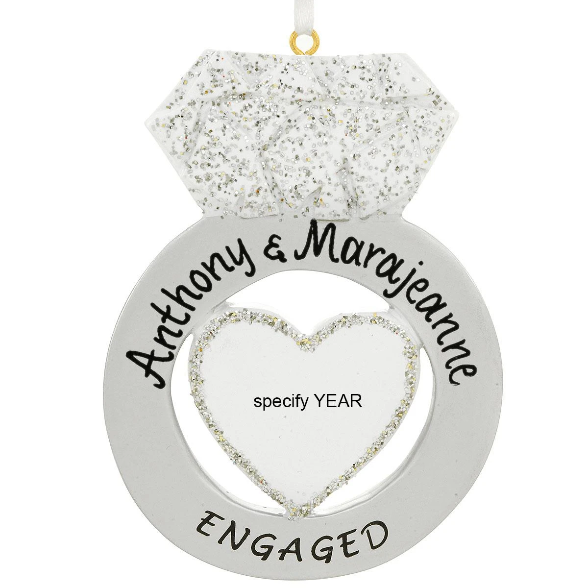 Celebrate the joyous occasion with a special personalized keepsake for the newly engaged couple in your life. Whether personalized with a black paint pen by our professional Bronner’s artists at no additional charge or plain, this charming engagement ring ornament is sure to be a treasured keepsake with your loved ones for years to come. With eye-catching glazes and sparkling silver glitter accents, this personalized engagement ring ornament is 4″ tall and crafted of resin. Comes ready to hang with a white ribbon.