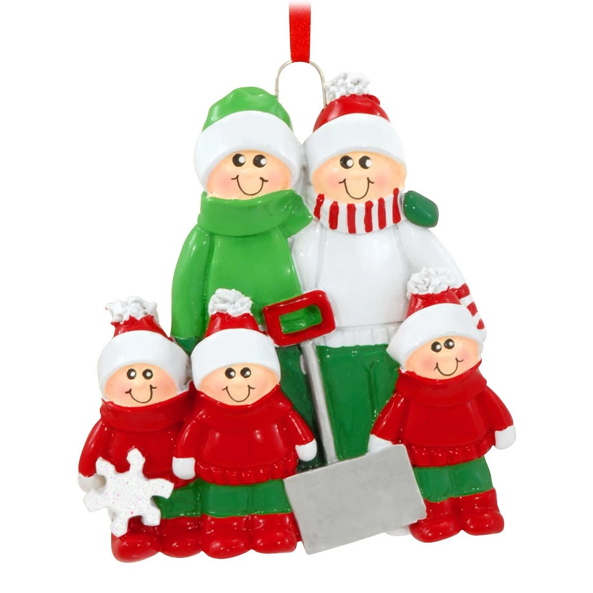 Whether making snow angels or simply shoveling out the driveway, there’s snow-time like the holidays for family fun! Artfully crafted of resin in hues of Christmas red and green, our 3¾” tall personalized family of 5 with snow shovel ornament comes ready to hang with a red ribbon. Allow one of our professional Bronner’s artists to add a touch of personal-izationâ„¢ with a black paint pen at no additional charge for and up-lift-ing gift the whole family will enjoy! Please select the alternate image for a view of this ornament without personalization.
