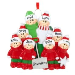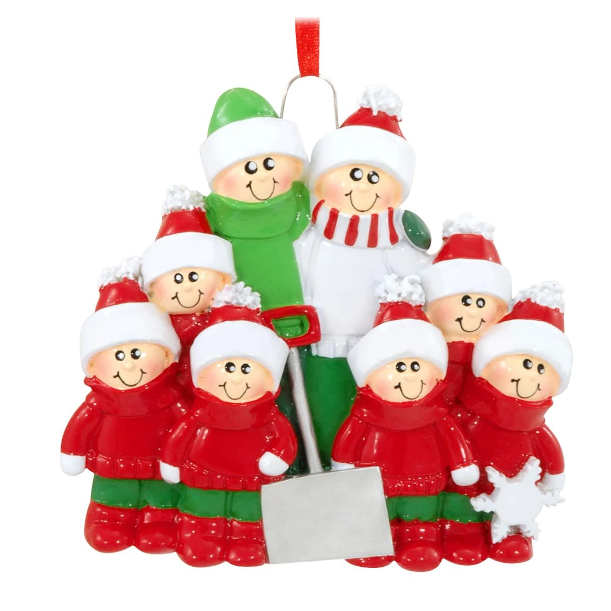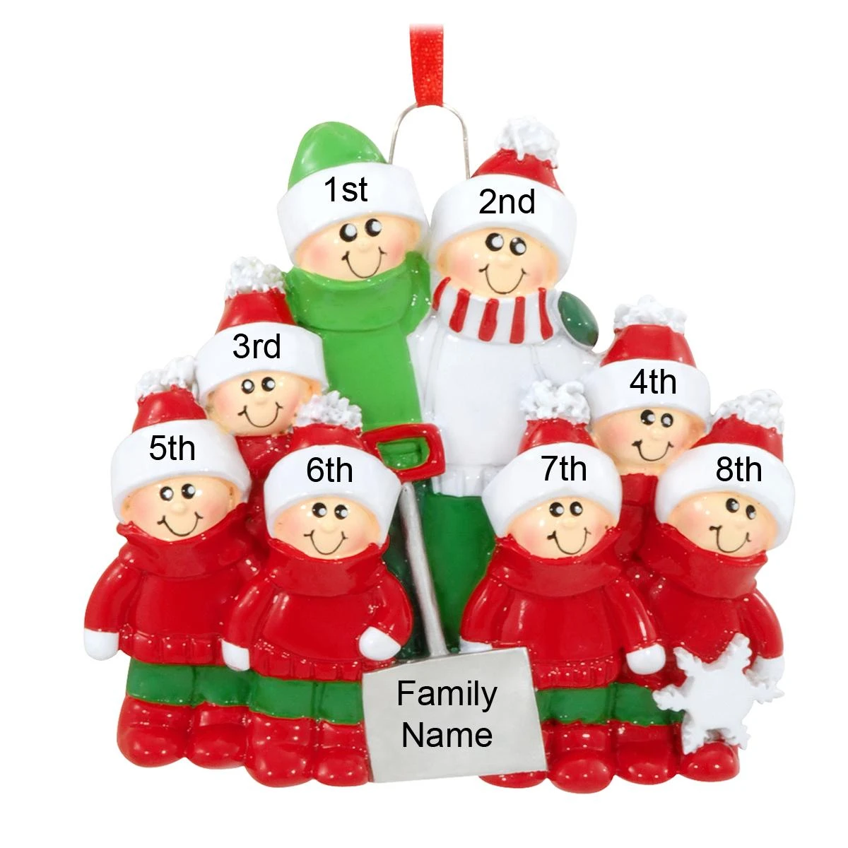 Whether making snow angels or simply shoveling out the driveway, there’s snow-time like the holidays for family fun! Artfully crafted of resin in hues of Christmas red and green, our 3¾” tall personalized family of 8 with snow shovel ornament comes ready to hang with a red ribbon. Allow one of our professional Bronner’s artists to add a touch of personal-ization™ with a black paint pen at no additional charge for and up-lift-ing gift the whole family will enjoy! Please select the alternate image for a view of this ornament without personalization.