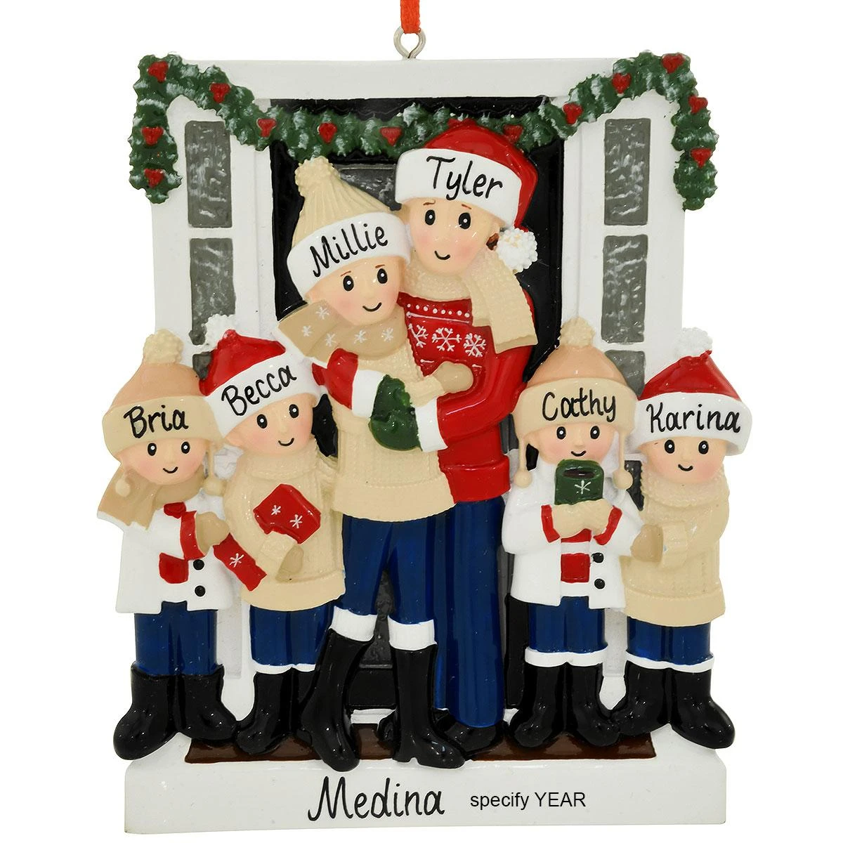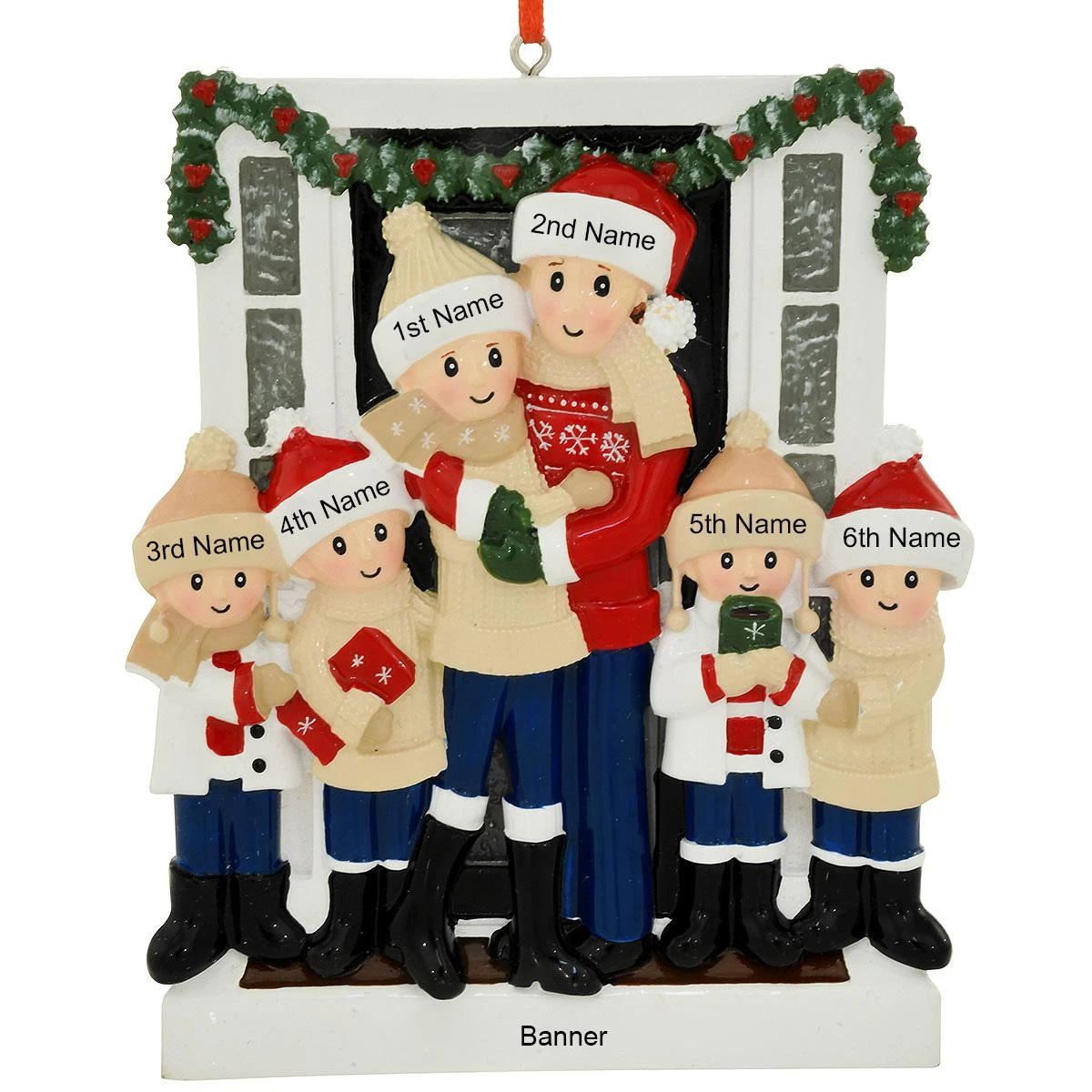Home for the holidays in the coziest place to be! Dressed in warm sweaters, hats, and boots, a happy family of 6 stand outside their front door festively decorated with garland and snow-flocked pines. Mom and dad snuggle up close while the four kids hold a Christmas present and mug of hot cocoa. Expertly crafted of resin with colorful hand-painted glazes, our farmhouse family of 5 ornament measures approximately 4½” tall and comes ready to hang with a red ribbon. For a gift that’s truly unique, why not allow Bronner’s to personalize this keepsake in black paint pen at no additional charge?