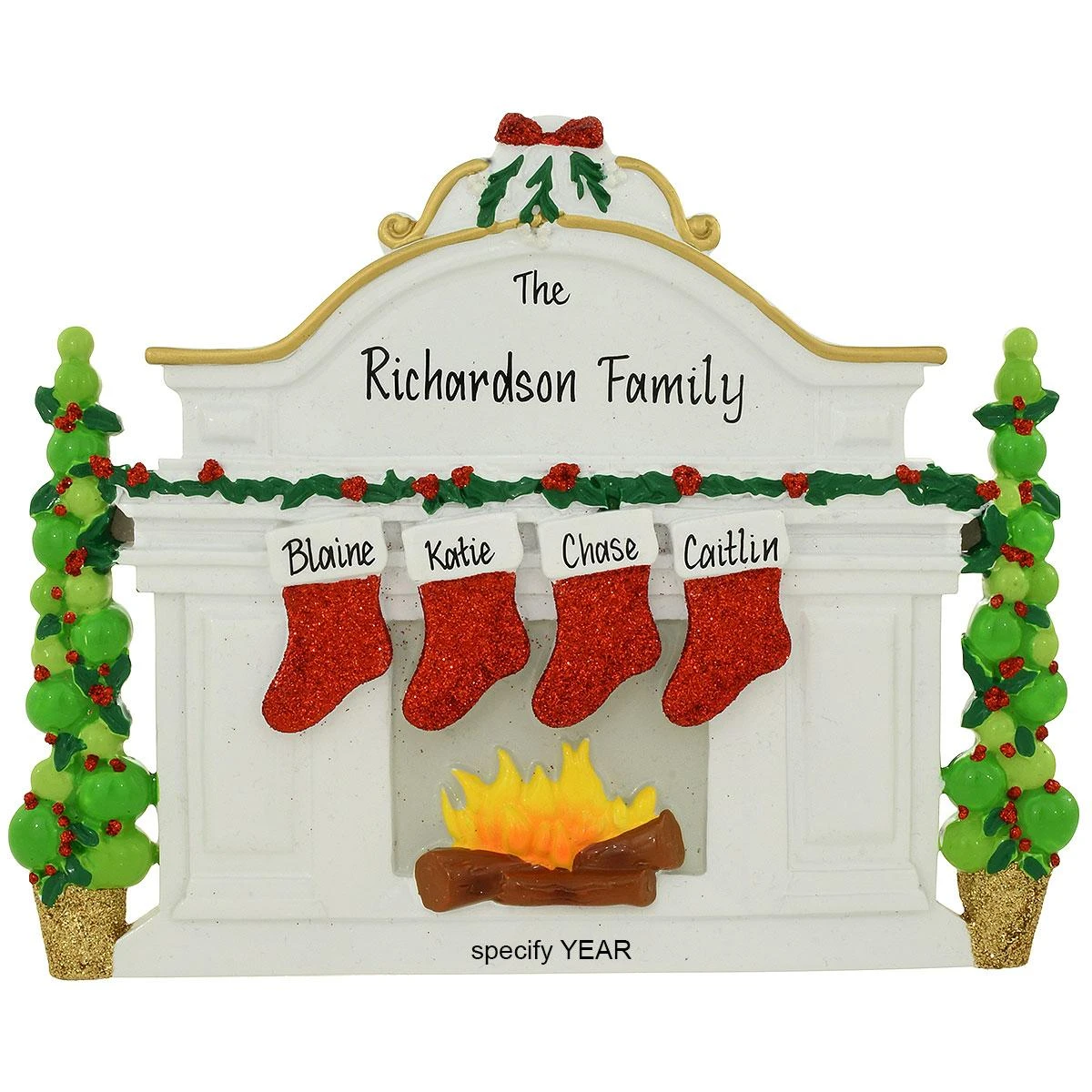 These stockings are hung by the chimney with care with a festive design beyond compare! Skillfully crafted of resin, our personalized 6¼” tall x 7¾” wide fireplace mantle with 4 stockings tabletop display has an attached picture frame-type easel that allows it to stand on any flat surface. Allow one of our talented Bronner’s artists to add a personalized touch with a black paint pen at no additional charge. Your family will bask in the glow of this heart warming display!