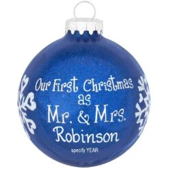Always remember that special first Christmas you shared together with our beautiful blue glitter ornament! With a revolutionary interior coating of glitter that shines through the clear glass like an infinite number of stars, our vivid blue glitter glass ornament is adorned with a variety of shimmering iridescent glitter snowflakes and the sweet sentiment, Our First Christmas as Mr. & Mrs. Measuring 3″ tall and exclusively crafted in Hungary for Bronner’s, this shimmering blue first Christmas as Mr. and Mrs. ornament is sure to have personal-ityâ„¢ when you allow one of our talented Bronner’s artists to add a personalized touch with a white paint pen at no additional charge.