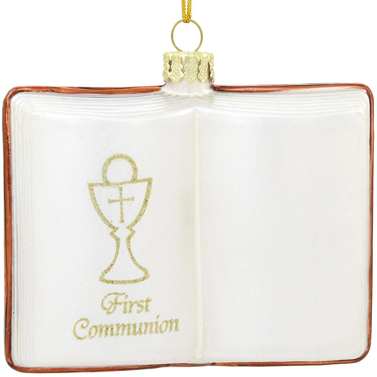 Commemorate the special occasion of a loved one’s First Communion with this beautiful keepsake gift. Artfully crafted in glass exclusively for Bronner’s, our sculpted book form ornament depicts an open Bible adorned with a chalice, wafer and cross above the sentiment First Communion. Gleaming with opalescent white glazes and gold glitter accents, this handsome ornament measures 3″ tall x 3½” wide and comes ready to hang on a gold cord. The reverse side has a shiny copper finish embellished with a sparkling gold cross. Allow one of our professional Bronner’s artists to hand-paint a personalized touch in glistening gold paint at no additional charge!
