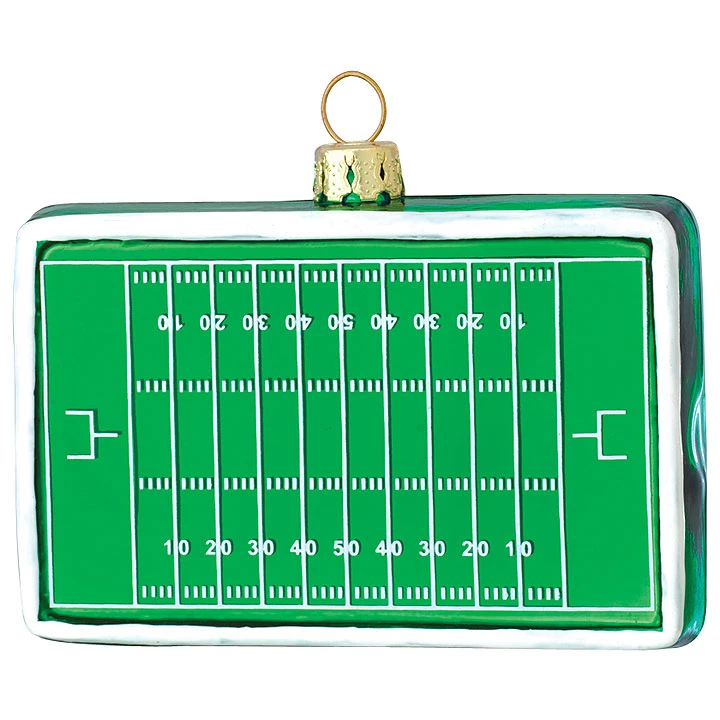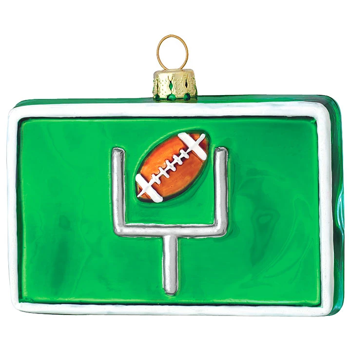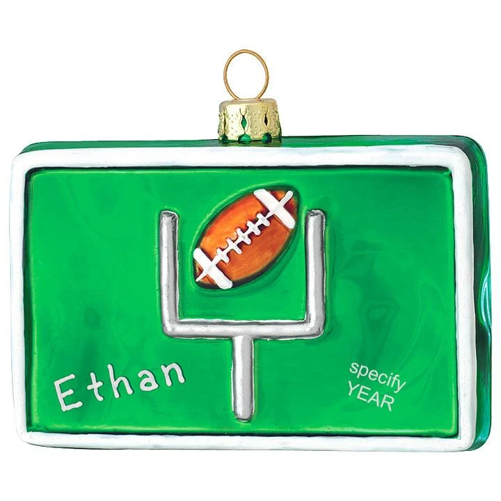 You may feel like you’ve made a fumble this Christmas if you pass by our magnificent ornament! Exclusively crafted from glass for Bronner’s, this double-sided ornament measures 2″ tall by 3½” wide and comes ready to hang with a gold cord. With sparkling glitter accents, a football field is detailed on one side while the other features a football passing through a goalpost. Allow one of our professional Bronner’s artists to add a personal touch with a silver paint pen at no additional charge that will make this football field ornament a favorite keepsake for your enthusiast!