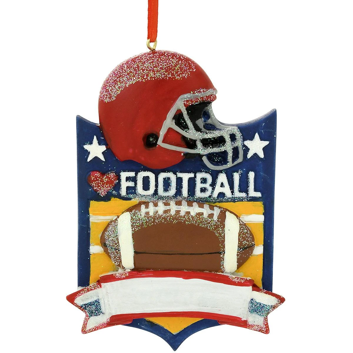 Sport-ing the sentiment ♥ FOOTBALL, this unique ornament is sure to score big with your special player or fan! Hand-painted with a myriad of colorful glazes and sparkling glitter accents, our personalized football resin ornament depicts a helmet and football atop a shield of yellow, white, and blue. Measuring approximately 4″ tall, this winning keepsake comes ready to hang with a red ribbon. If “personal-ityâ„¢” is your goal, why not allow Bronner’s to add the name of your choice with a black paint pen at no additional charge?!