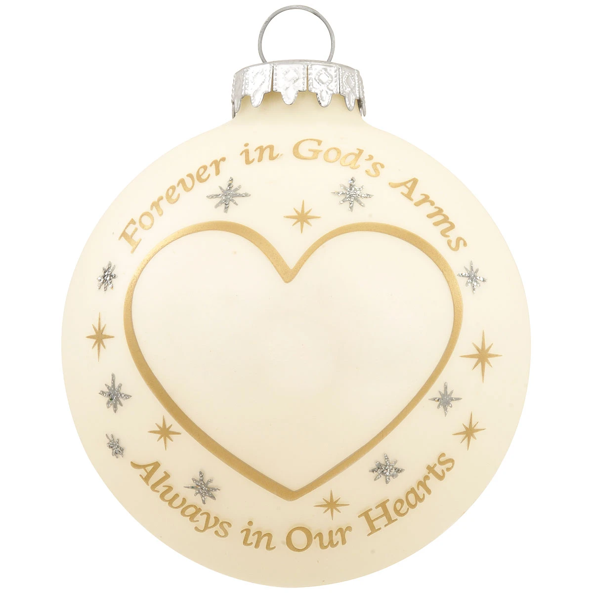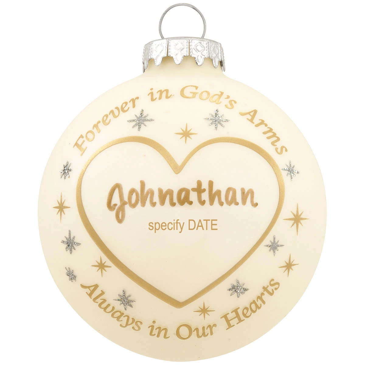 Commemorate the life of a loved one that has passed on with this unique personalized keepsake. Artfully crafted of glass from Hungary, our 3″ tall ornament has a smooth ivory tone finish and features the sentiment Forever in God’s Arms Always in Our Hearts, which appears above and below a heart shape in a metallic gold finish. Accented with a pattern of alternating silver glitter and gold enamel stars, this Bronner’s exclusive ornament can be personalized with the name of your loved one by one of our professional Bronner’s artists with a gold paint pen at no additional charge.