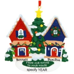 Send a heartfelt greeting to a special neighbor, friend, or loved one with this charming ornament! Personalized with a black paint pen by our professional Bronner’s artists at no additional charge, this 4¼” tall resin ornament features two festively decorated houses joined together by a path, a Christmas tree, and a patch of grass but most of all the sentiment “From Our House To Your House”. With sparkling glitter accents, this unique “from our house to your house” ornament comes ready to hang with a red ribbon.