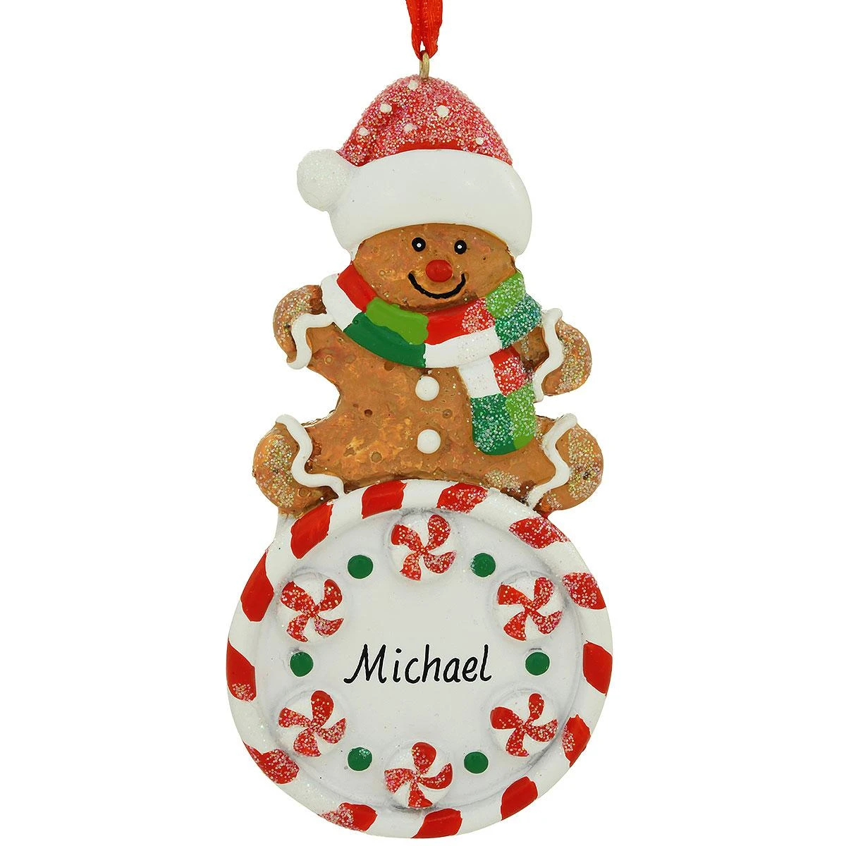 Our gingerbread man is running “just as fast as he can” to spice up your tree with appet-eye-zing appeal this holiday season! Artfully crafted from colorful resin and coming ready to hang with a red ribbon, this 4½” tall ornament features a gingerbread man, with “icing” accents, wearing a plaid scarf and polka dot Santa hat and sitting on top of a round peppermint disk speckled with spearmint candies. Allowing one of our professional Bronner’s artists to add a personalized touch in permanent black ink just proves that it’s certainly no cookie cutter keepsake!