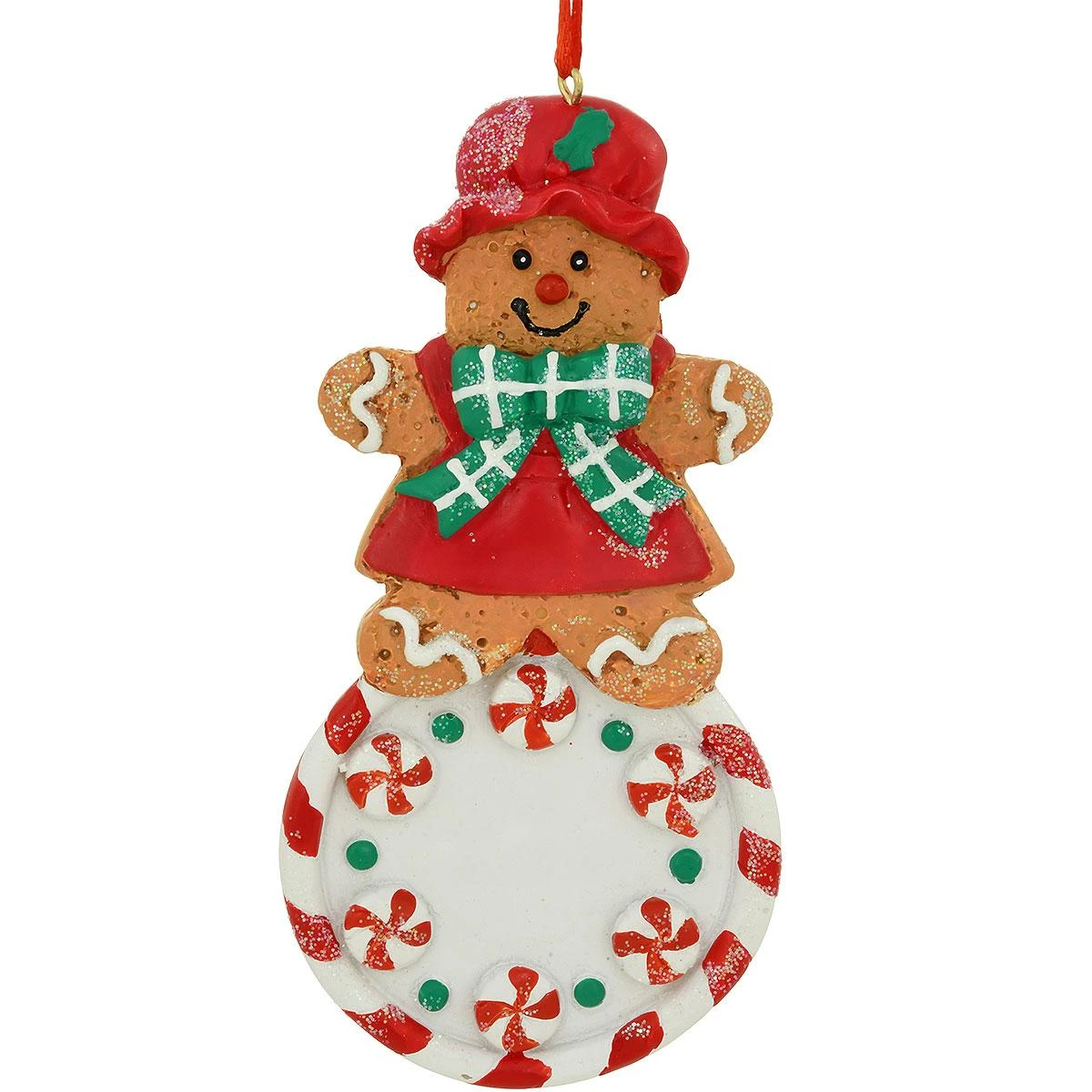 Our gingerbread woman is running “just as fast as she can” to spice up your tree with appet-eye-zing appeal this holiday season! Artfully crafted from colorful resin and coming ready to hang with a red ribbon, this 4¼” tall ornament features a gingerbread girl, with “icing” accents, wearing a plaid bow and red dress and cap while sitting on top of a round peppermint disk speckled with spearmint candies. Allowing one of our professional Bronner’s artists to add a personalized touch in permanent black ink just proves that it’s certainly no cookie cutter keepsake!