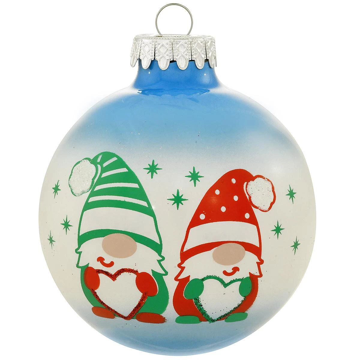 For this happy couple…GNOME is where the heart is! Our shimmering 2 tone blue and white ornament is artfully crafted in glass and features a gnome couple holding hearts as stars twinkle all around. Adorned with vivid red and green glazes and iridescent hand-glittered accents, this 4″ round keepsake makes an enchanting gift for the special couple on your list! Crafted in Hungary exclusively for Bronner’s.Â